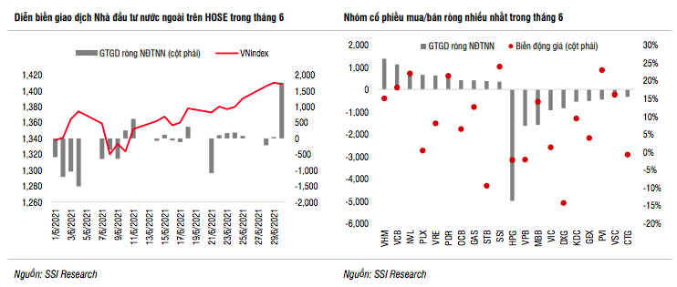 Theo SSI Research, định giá thị trường đã phản ánh một phần mức tăng trưởng lợi nhuận tích cực của doanh nghiệp trong quý 2 và nửa đầu năm. Tăng trưởng điểm số của VN-Index trong tháng 6 đã đưa hệ số định giá P/E hiện tại và hệ số định giá P/E năm 2021 của chỉ số từ mức 18,18 lần và 16,19 lần vào thời điểm cuối tháng 5 lên mức 19,35 lần và 17,08 lần vào ngày 02/7.