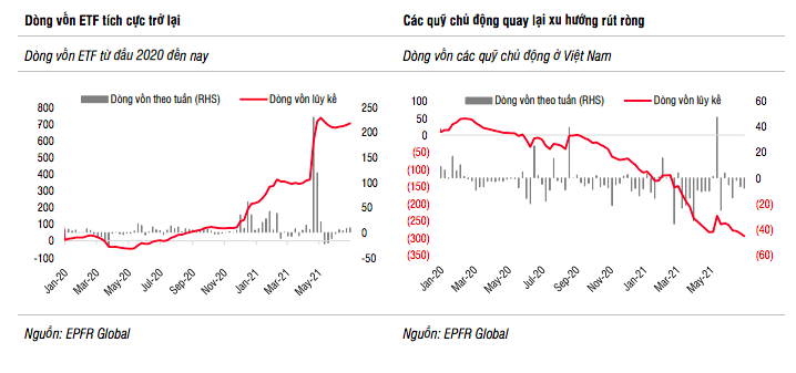 Trong những ngày đầu tháng 7, tiếp tục ghi nhận xu hướng tích cực ở các quỹ VFM VN30, VFM VNDiamond và Fubon mua ròng trở lại. Bên cạnh đó, quỹ Asian Growth CUBS ETF mới được thành lập trong tháng 6 dù quy mô quỹ còn nhỏ (2 triệu USD) và chỉ khoảng 27% tổng tài sản của quỹ được phân bổ vào thị trường Việt Nam nhưng cũng được kỳ vọng sẽ thu hút thêm dòng vốn trong thời gian tới.