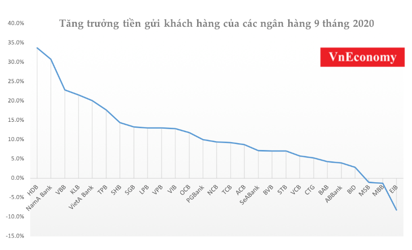 Ở phía huy động vốn, NamABank có mức tăng tín dụng cao thì đi cùng đó, tăng trưởng tiền gửi cũng tăng trên 30,7% trong 9 tháng. Ở mặt khác, Eximbank cũng vừa là ngân hàng có tăng trưởng tín dụng thấp nhất (-10,5%) và tăng trưởng tiền gửi thấp nhất (-8,2%). Thế nhưng đối với MSB, dù dư nợ cho vay tăng cao thứ 2 trong bảng (15,5%) tuy nhiên tiền gửi khách hàng lại sụt giảm nhẹ 1%.