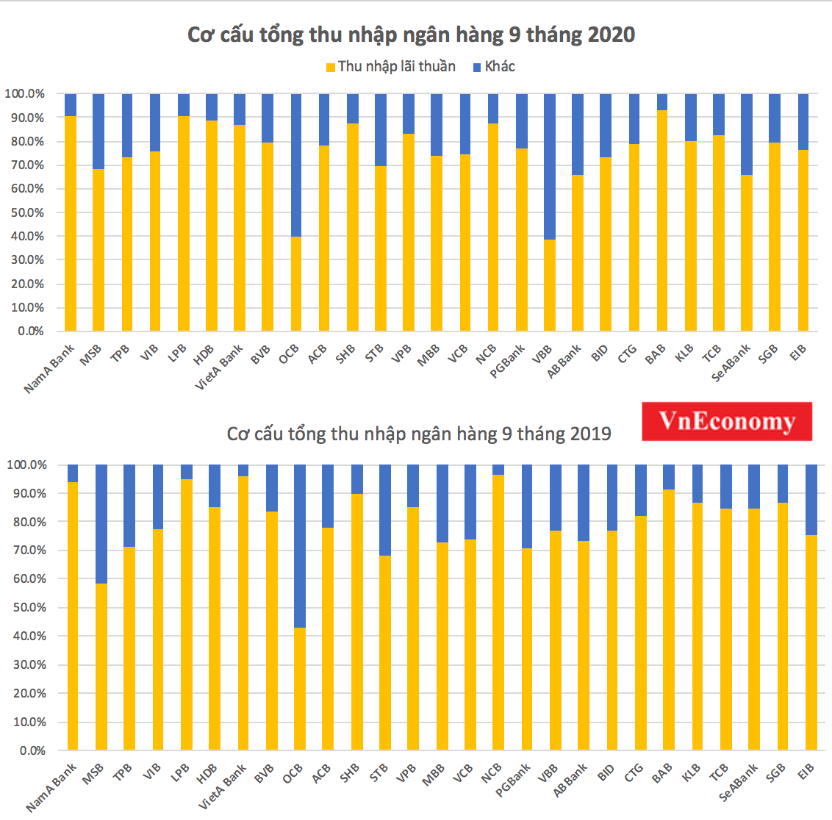 Thống kê của VnEconomy cho thấy, so với cùng kỳ năm ngoái, tỷ lệ thu nhập ngoài lãi/tổng thu nhập của phần lớn các ngân hàng đều đã tăng lên, cho thấy các mảng hoạt động khác đang dần đỡ gánh nặng trong việc gia tăng lợi nhuận.