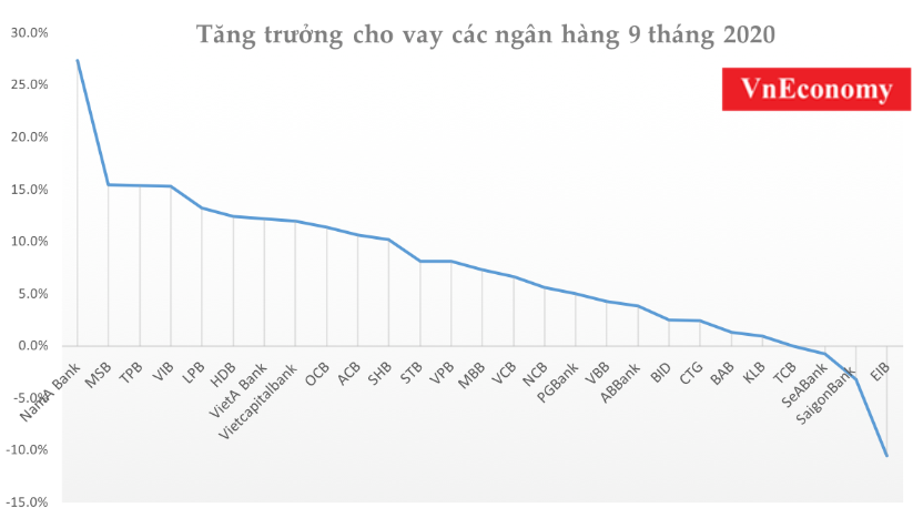 Mức tăng lớn nhất đến từ NamABank - một ngân hàng nhỏ trong hệ thống nhưng dư nợ cho vay trong kỳ đã tăng 27,3%. Các ngân hàng khác có tăng trưởng cho vay tăng trên 15% trong 9 tháng gồm TPBank (15,5%), VIB (15,3%) và MSB (15,5%).