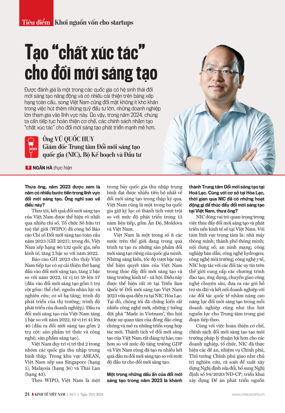 Việt Nam là một trong số ít các nước trên thế giới đang trong quá trình tự tạo ra những sản phẩm đổi mới sáng tạo riêng của quốc gia mình. Những sáng kiến, tốc độ vượt bậc này thể hiện quyết tâm của Việt Nam trong thúc đẩy đổi mới sáng tạo và tăng trưởng kinh tế - xã hội. Điều này được thể hiện rất rõ tại Triển lãm Quốc tế Đổi mới sáng tạo Việt Nam 2023 vừa qua diễn ra tại NIC Hòa Lạc. Tại đó, chúng tôi đã chứng kiến rất nhiều công nghệ mới, những ý tưởng đột phá “Made in Vietnam”, thu hút được sự quan tâm của đông đảo công chúng và mở ra những triển vọng hợp tác mới. Thành tích về đổi mới sáng tạo của Việt Nam rất đáng tự hào, cao hơn so với mức độ tăng trưởng GDP và Việt Nam cũng đã tạo ra nhiều kết quả đầu ra đổi mới sáng tạo so với mức độ đầu tư cho đổi mới sáng tạo.