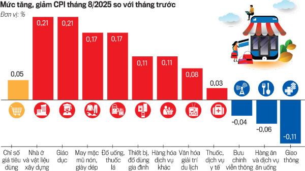 Chỉ số giá tiêu dùng (CPI) tháng 8/2025 ghi nhận mức tăng nhẹ 0,05% so với tháng trước, cho thấy áp lực lạm phát trong năm nay vẫn được kiểm soát hiệu quả...