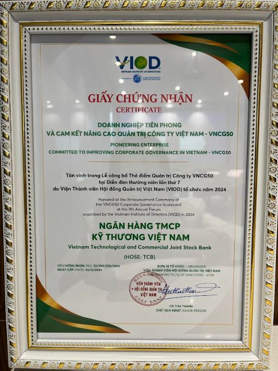 Trải qua quy trình đánh giá nghiêm ngặt từ các chuyên gia quản trị doanh nghiệp, đại diện quỹ đầu tư, công ty chứng khoán và tổ chức quốc tế, Techcombank đã xuất sắc được vinh danh trong Top 50 doanh nghiệp niêm yết có điểm quản trị công ty tốt nhất năm 2024. Thành tích này khẳng định vị thế của Techcombank trong việc áp dụng các chuẩn mực quản trị minh bạch, nâng cao hiệu quả tài chính và hướng tới phát triển bền vững.