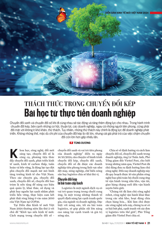 Tại Diễn đàn Kinh tế mới Việt Nam 2024 thường niên lần thứ 2 với chủ đề “Khởi tạo nền kinh tế mới: Cách mạng trong chuyển đổi số- chuyển đổi xanh và vai trò tiên phong của doanh nghiệp” diễn ra ngày 16/10/2024, câu chuyện về hành trình chuyển đổi kép, chuyển đổi xanh, chuyển đổi số đã được các doanh nghiệp tiên phong trong lĩnh vực như dệt may, nông nghiệp, chế biến nông sản hay logistics chia sẻ khá thú vị.