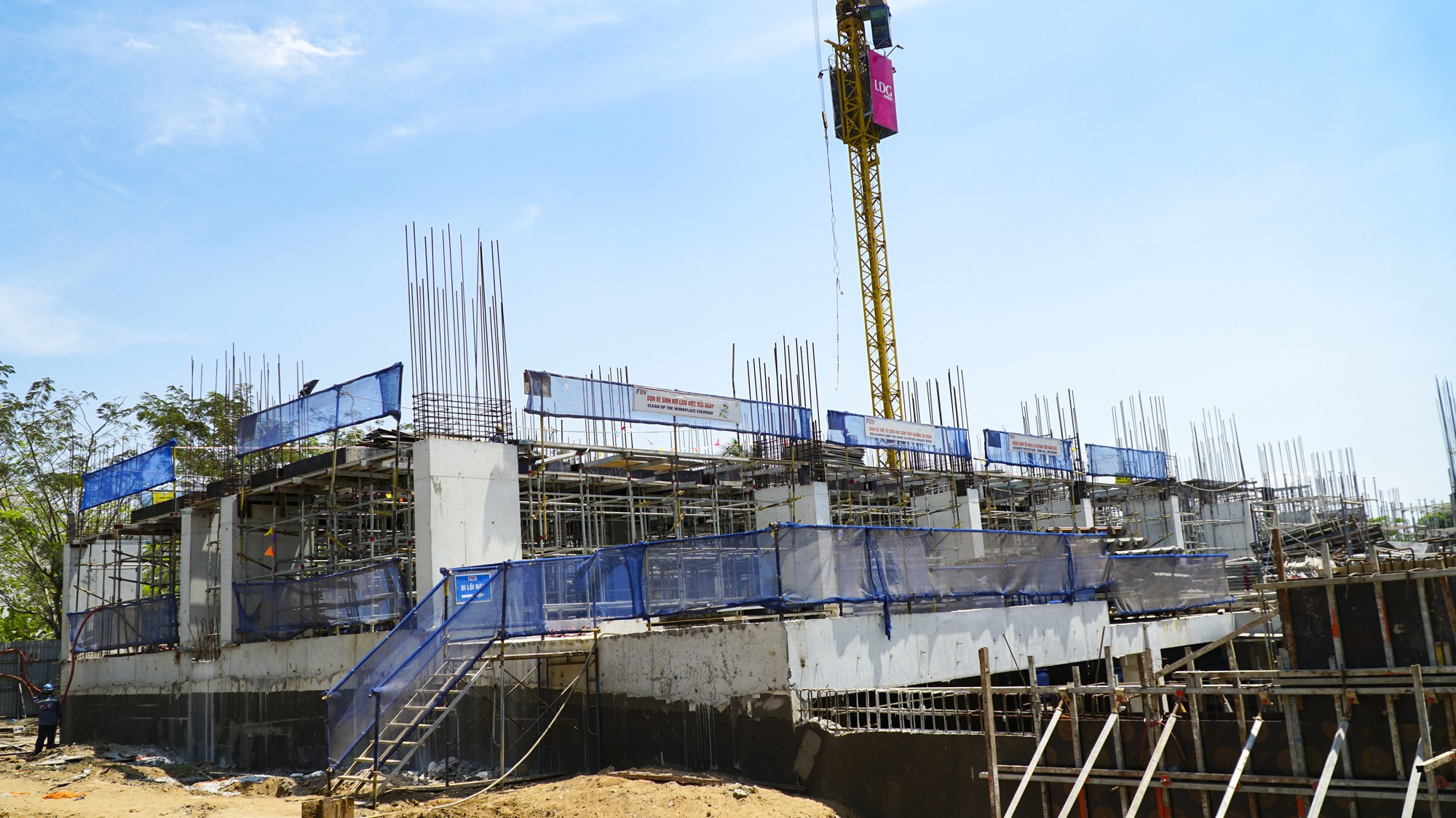 Khảo sát tại công trường dự án, khu căn hộ này có 2 tầng hầm rộng rãi lên đến hơn 12.000m2. Việc thi công hai tầng hầm này chiếm nhiều thời gian và kinh phí do nằm sát bên sông. Đến nay hai tầng hầm này đã hoàn thành. Tính đến thời điểm phóng viên khảo sát, có hàng trăm công nhân đang thi công đến sàn tầng 2 của phần thân dự án.