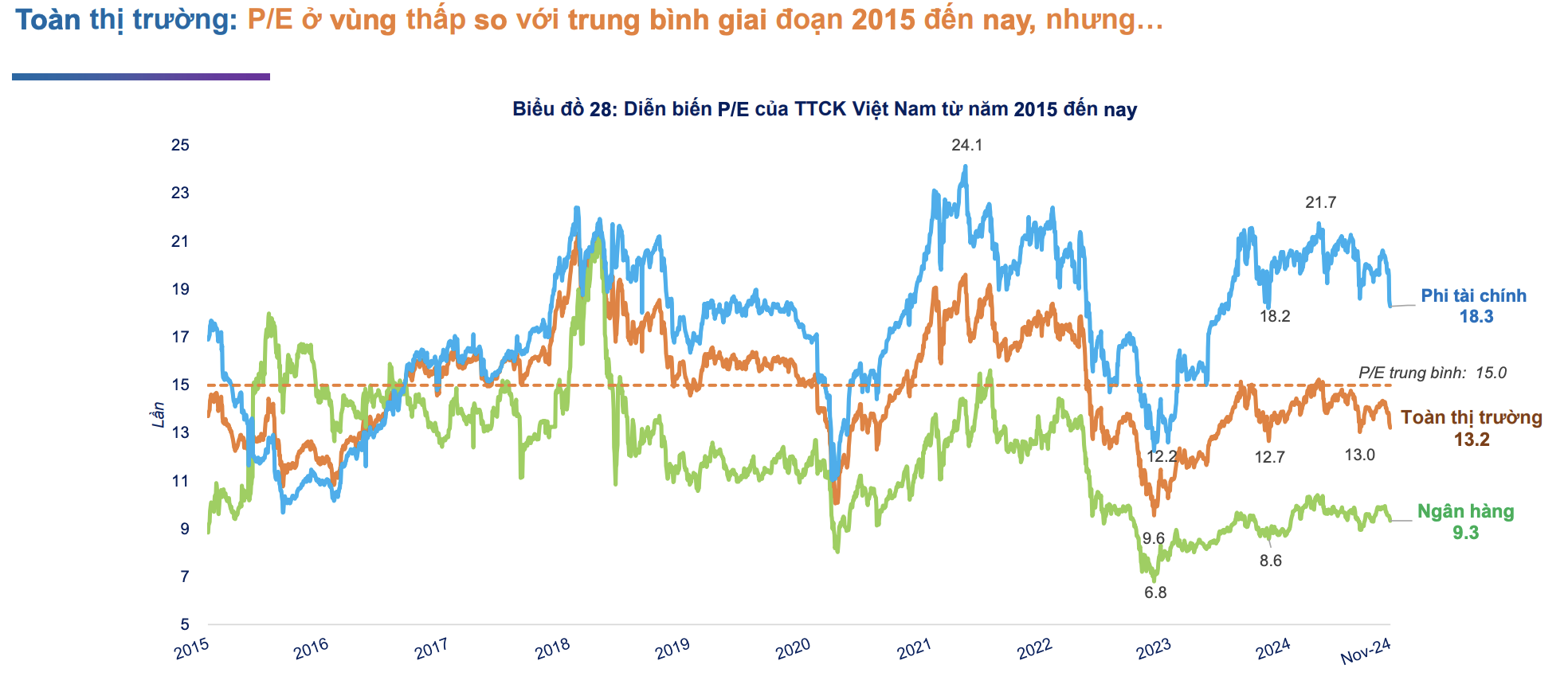 Sau khi kết quả kinh doanh quý 3/2024 được cập nhật cùng với nhịp điều chỉnh nhẹ gần đây VN-Index giảm 4% trong gần 1 tháng, P/E toàn thị trường hiện ở mức 13,2x, thấp hơn khoảng 12% so với mức trung bình giai đoạn từ 2015 đến nay và tiếp tục bị tác động bởi mức P/E thấp của ngành Ngân hàng trong khi đó, P/E vẫn neo ở mức cao với nhóm Phi tài chính.