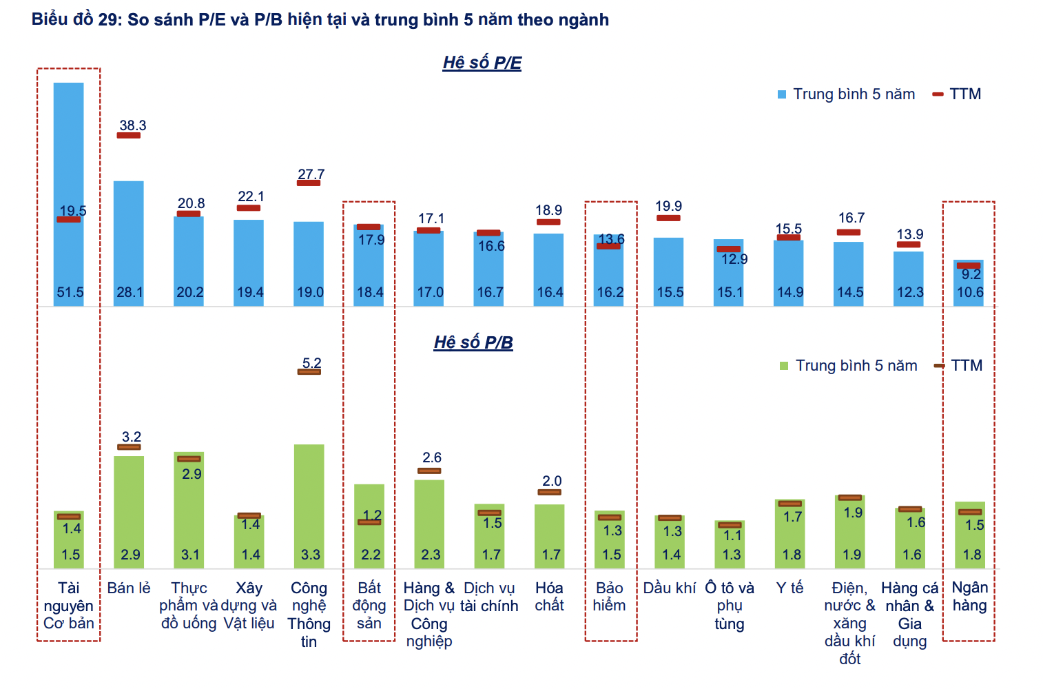 Trong khi đó, chỉ có 4/19 ngành đang giao dịch ở nền định giá dựa trên hệ số P/E và P/B thấp hơn so với trung bình 5 năm, bao gồm Ngân hàng, Bảo hiểm, Bất động sản, Tài nguyên cơ bản chủ yếu là Thép.