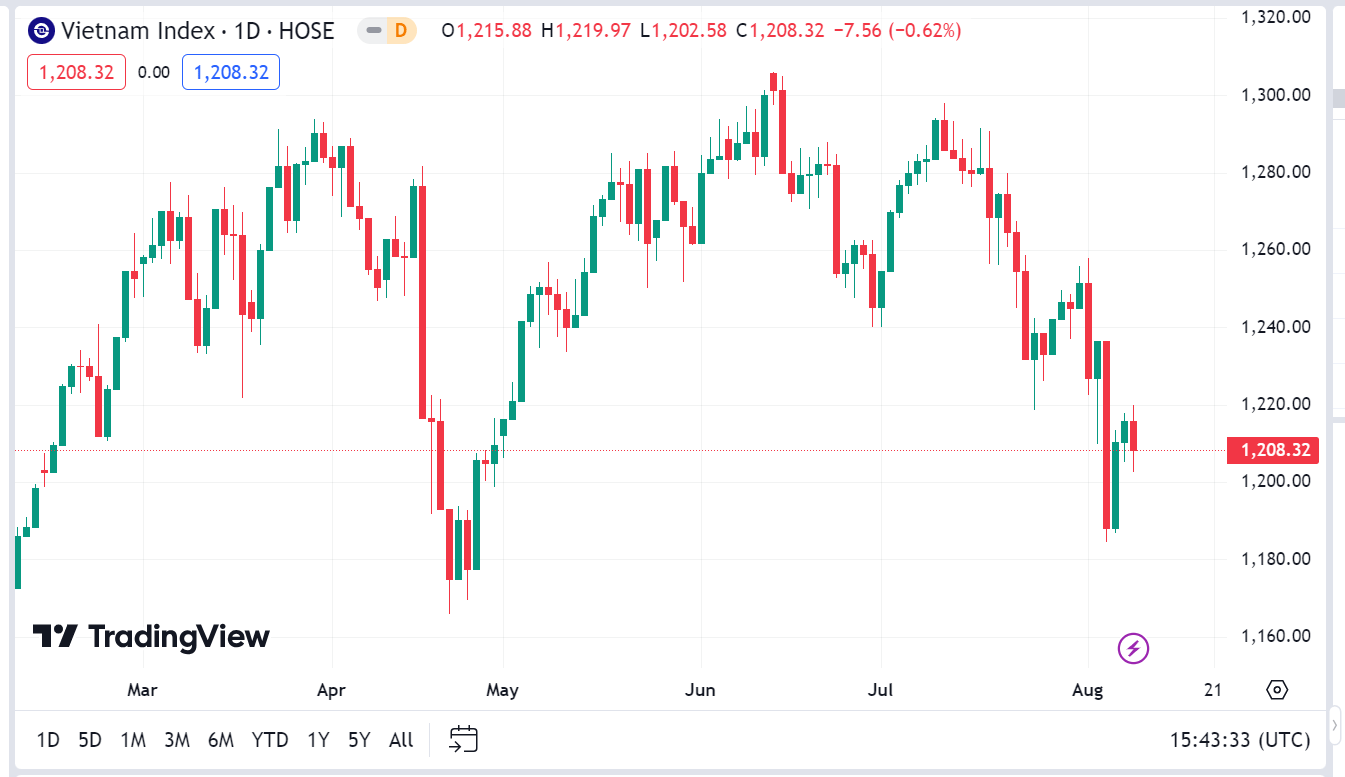 Kết thúc phiên ngày 8/8, Áp lực bán bao trùm phiên chiều khi kiểm định vùng 1.220 không thành công khiến VN-Index giảm 7,56 điểm, tương đương 0,62% xuống mốc 1.208,32. Cùng chiều, Hnx-Index giảm 1,22 điểm, tương đương 0,54% xuống 226,73 điểm.