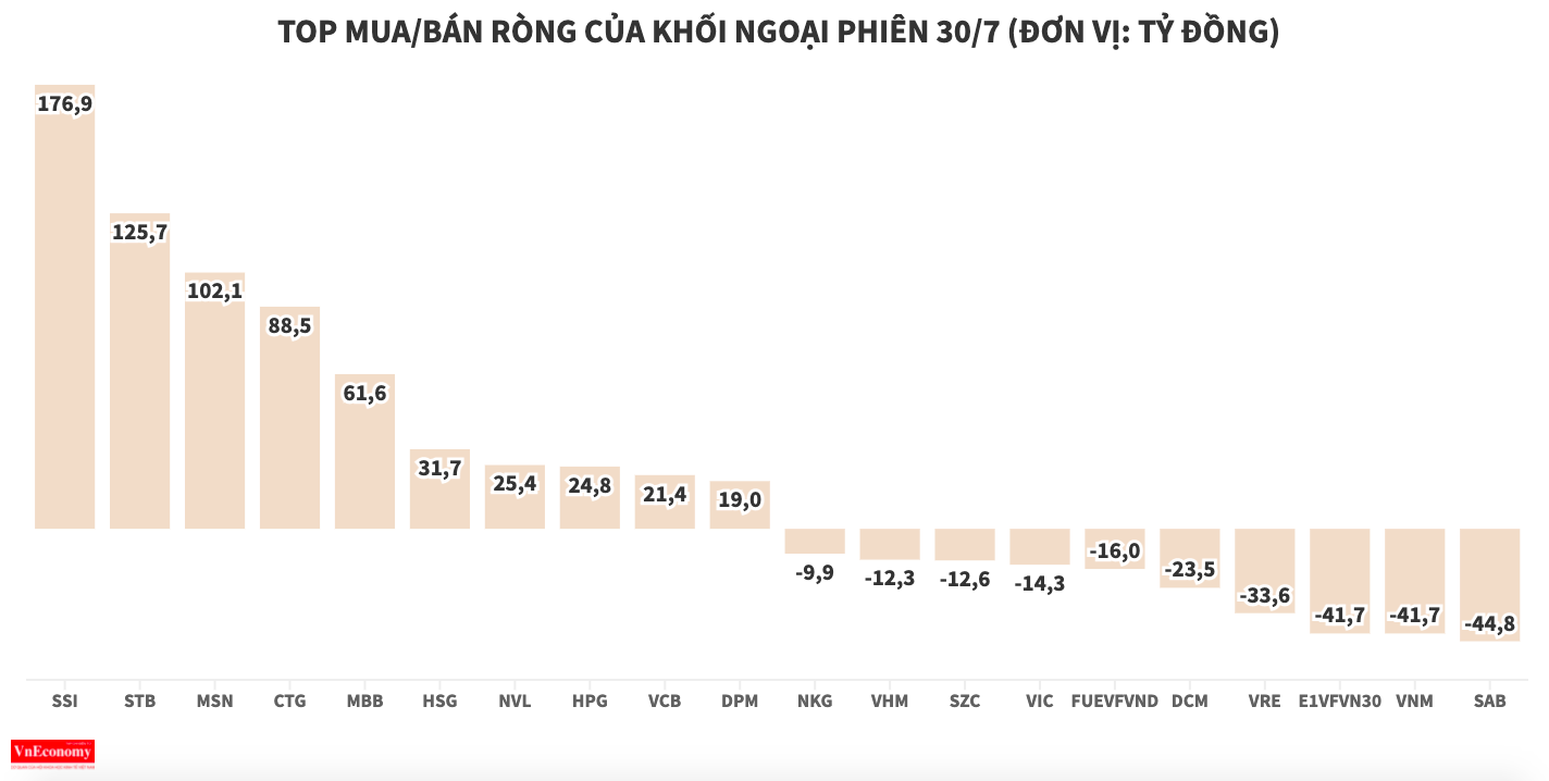 Ở chiều mua, SSI dẫn đầu danh sách với 176,9 tỷ đồng. Ngoài ra, họ cũng tập trung mua các blue-chips khác như STB với 125,7 tỷ đồng; MSN với 102,7 tỷ đồng; CTG với 88,5 tỷ đồng; MBB với 61,6 tỷ đồng; NVL với 25,4 tỷ đồng; HPG với 24,8 tỷ đồng…