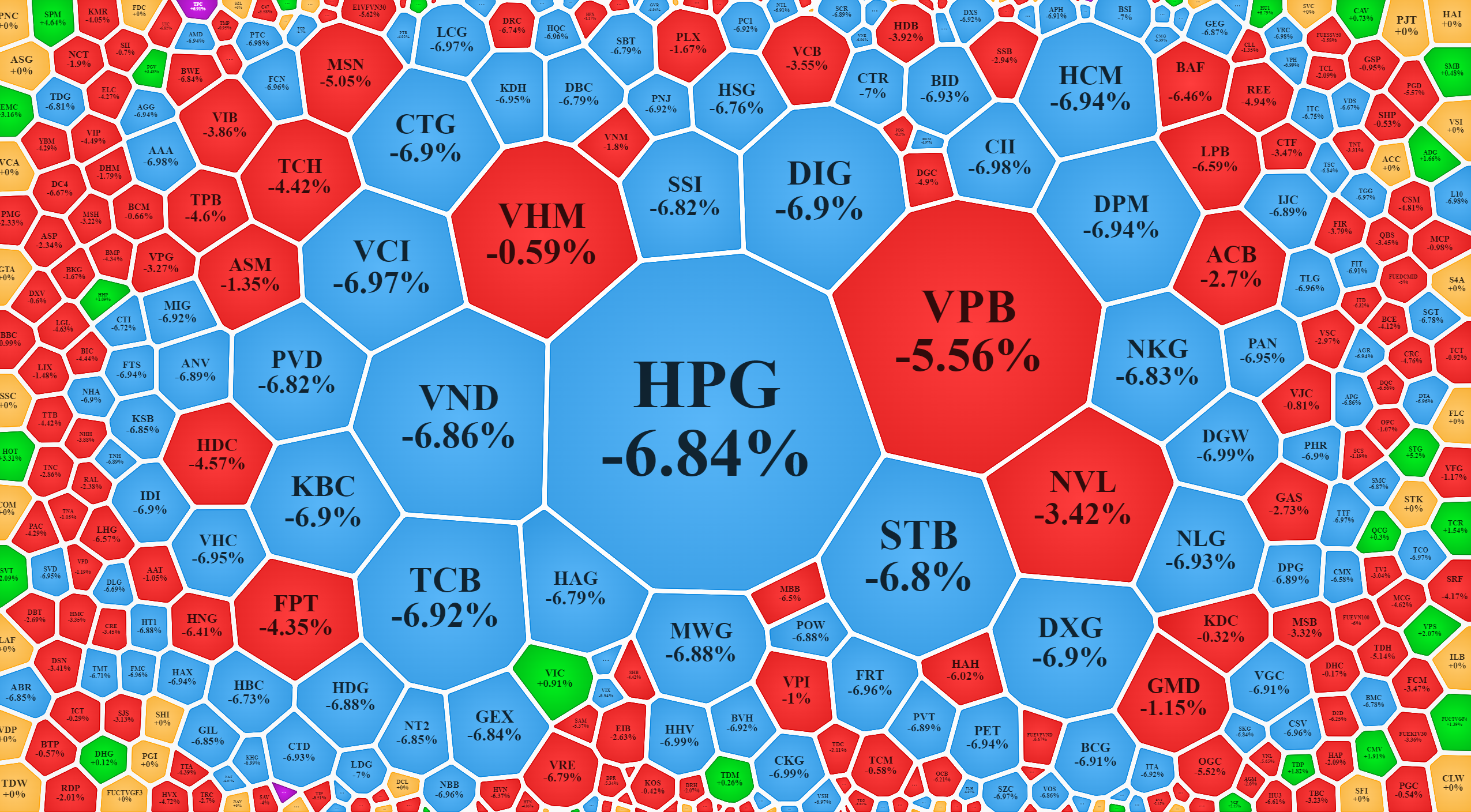 Hai cổ phiếu này thực tế lại càng làm nổi bật hơn tình trạng thê thảm ở phần còn lại của thị trường. Độ rộng sàn HoSE chỉ còn 449 mã giảm/43 mã tăng, trong đó 136 mã giảm sàn và 130 mã khác giảm trên 2%. Tất cả các nhóm cổ phiếu đều đỏ rực, trong đó ngân hàng có 4 mã giảm sàn và CTG, TCB, BID, STB. Chứng khoán có 20 mã giảm sản, bao gồm cả các blue-chips như SSI, HCM, VND, VCI.