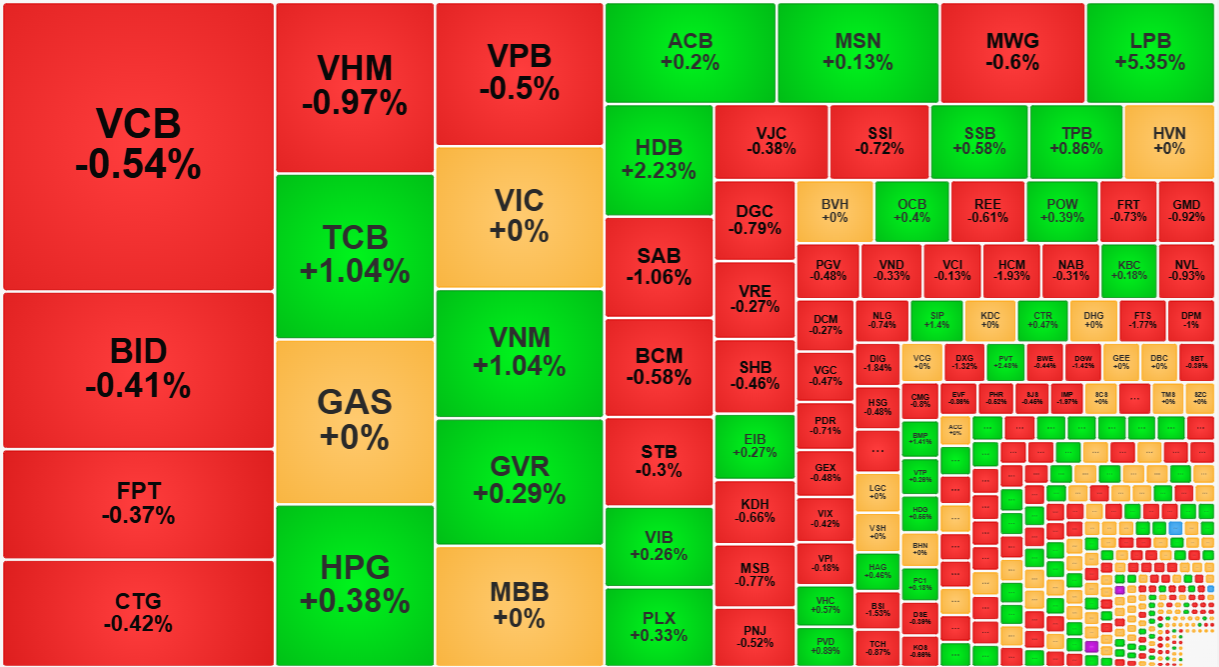 Dù vậy nhóm cổ phiếu vốn hóa lớn nhất vẫn là nguyên nhân khiến VN-Index không phục hồi rõ ràng để hỗ trợ tâm lý. Trong 10 mã vốn hóa hàng đầu thì có 6 mã giảm và 2 mã tăng, với 5 cổ phiếu lớn nhất đều đỏ là VCB giảm 0,54%, BID giảm 0,41%, FPT giảm 0,37%, CTG giảm 0,42% và VHM giảm 0,97%. Hai cổ phiếu xanh là TCB tăng 1,04% và HPG tăng 0,38%.