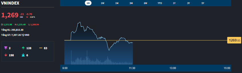 VN-Index kết phiên sáng giảm rất nhẹ 0,7 điểm nhưng vẫn có thể coi là một kết quả tốt. Dao động trong phiên cho thấy áp lực bán vẫn đang xuất hiện theo từng đợt và tạo sức ép lên giá, nhưng không thể đẩy biên độ gia tăng rộng như hôm qua. VN-Index tăng đạt đỉnh lúc 9h35 tăng gần 5,6 điểm và trượt giảm chạm đáy lúc 10h40, giảm xấp xỉ 3 điểm. Biên độ dao động đã hẹp lại đáng kể so với phiên trước.