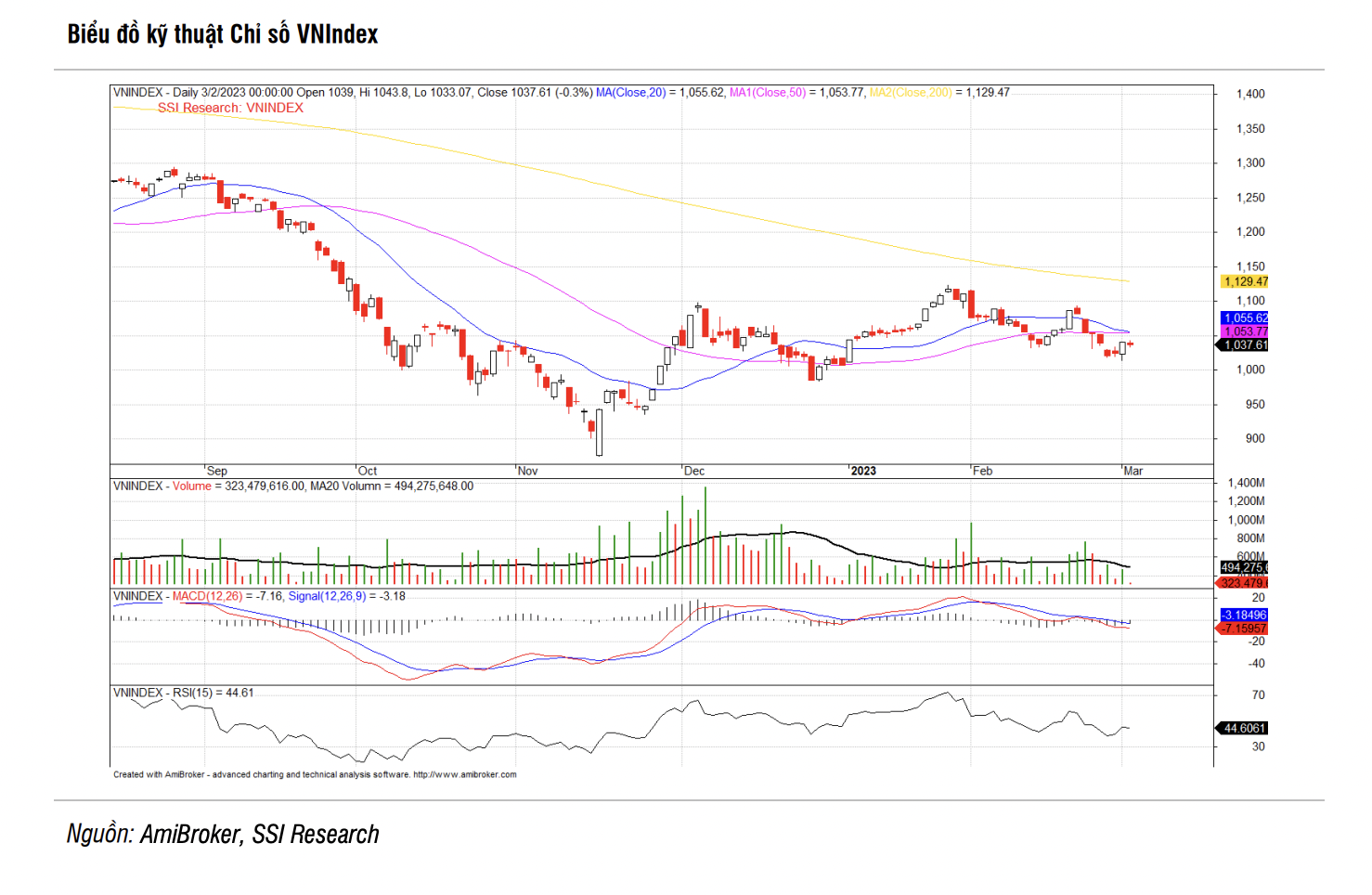 Trạng thái kỹ thuật hiện tại cũng cho thấy nhà đầu tư đang thận trọng chờ đợi. Chỉ số VN-Index điều chỉnh lại trong tháng 2 khi MA 20 ngày tiệm cận trở lại các đường MA trung hạn như MA 50, còn MACD vận động dưới mốc 0 xác nhận thêm cho xu hướng giảm ngắn hạn.
