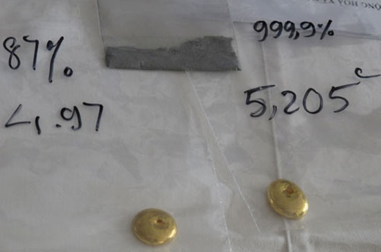 Cách 1 là cán mỏng vàng, sau đó đánh bóng bề mặt thì những hạt kim loại lạ như volfram sẽ nổi lên.