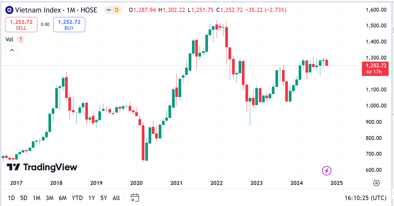 “Xu hướng ngắn hạn VN-Index tiếp tục chịu áp lực điều chỉnh về vùng giá quanh 1.245 điểm - 1.255 điểm, vùng giá cao nhất năm 2023, kháng cự gần nhất quanh 1.270 điểm. Xu hướng trung hạn VN-Index tăng trưởng trên vùng hỗ trợ quanh 1.250 điểm, hướng đến vùng giá 1.300 điểm. Trong đó vùng giá 1.300 điểm, vùng kháng cự rất mạnh tương vùng vùng giá cao nhất đầu từ đầu năm 2024 và đỉnh giá tháng 06-08/2022. Thị trường chỉ có thể vượt qua các vùng kháng cự này khi có các yếu tố hỗ trợ vĩ mô tốt, kết quả kinh doanh tăng trưởng vượt trội. Đồng thời các yếu tố bất định như căng thẳng địa chính trị như cuộc chiến Nga - Ukraine, Trung Đông hạ nhiệt.