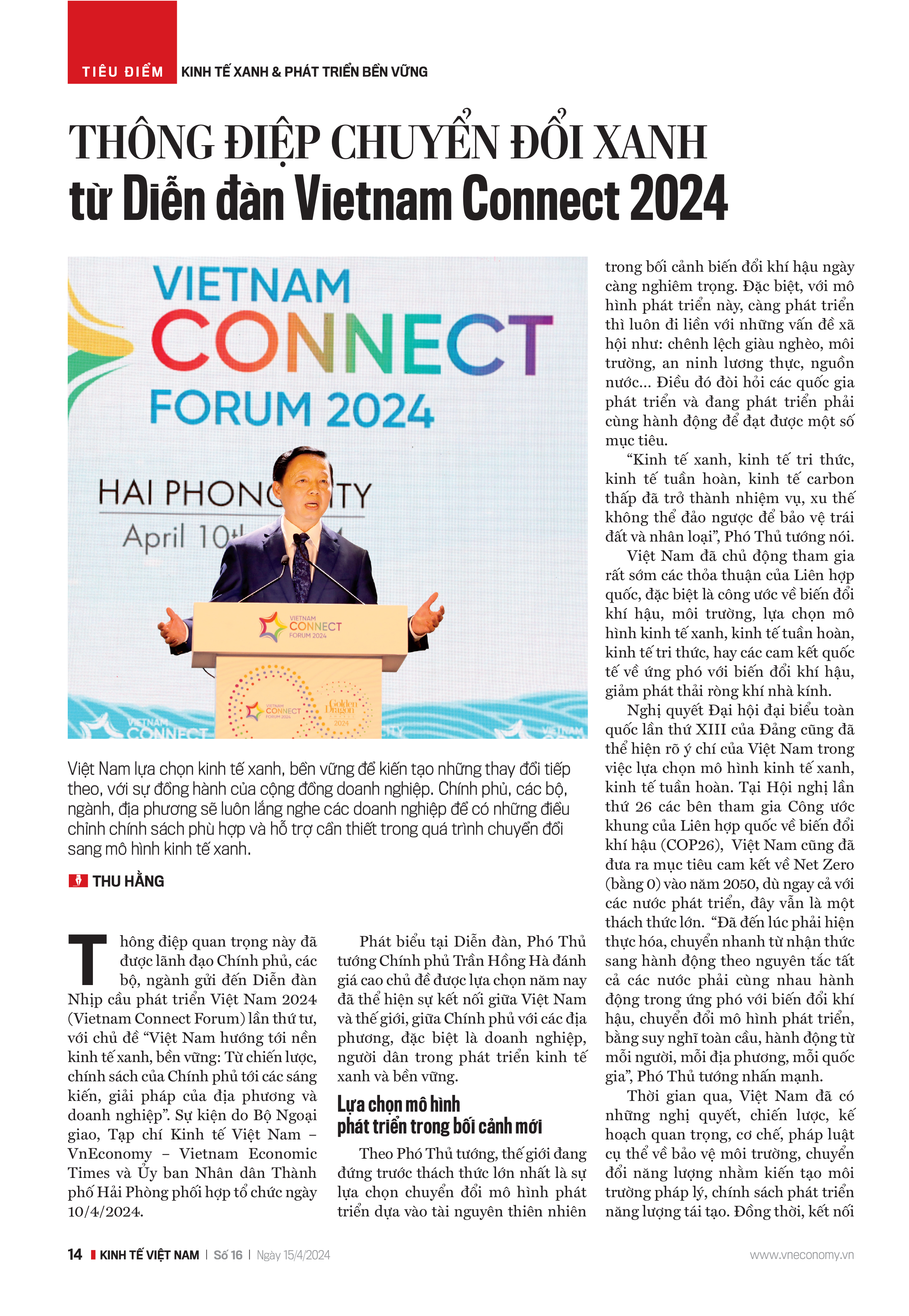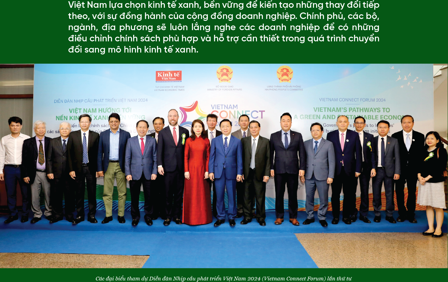 Thông điệp quan trọng này đã được lãnh đạo Chính phủ, các bộ, ngành gửi đến Diễn đàn Nhịp cầu phát triển Việt Nam 2024 (Vietnam Connect Forum) lần thứ tư, với chủ đề “Việt Nam hướng tới nền kinh tế xanh, bền vững: Từ chiến lược, chính sách của Chính phủ tới các sáng kiến, giải pháp của địa phương và doanh nghiệp”. Sự kiện do Bộ Ngoại giao, Tạp chí Kinh tế Việt Nam – VnEconomy – Vietnam Economic Times và Ủy ban Nhân dân Thành phố Hải Phòng phối hợp tổ chức ngày 10/4/2024.