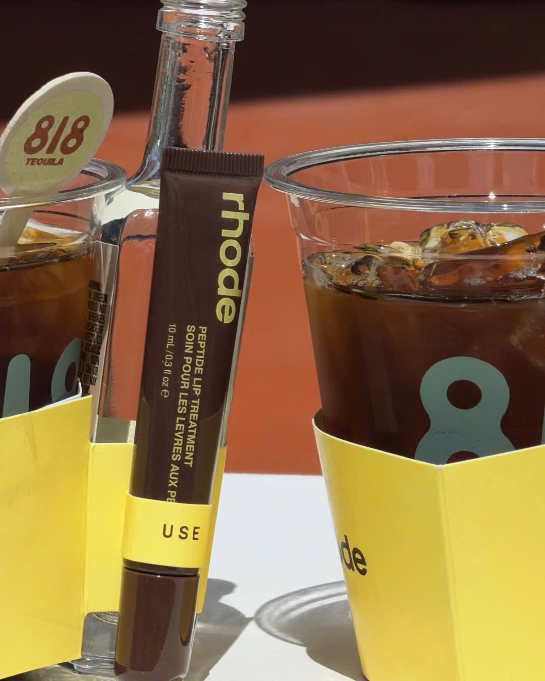 Thương hiệu Rhode của Hailey Bieber cũng xuất hiện tại 818 Outpost, nơi phát các loại cocktail chủ đề chuối kèm sản phẩm dưỡng môi peptide đặc trưng của Rhode gắn trên giá đỡ đồ uống đặc biệt.
