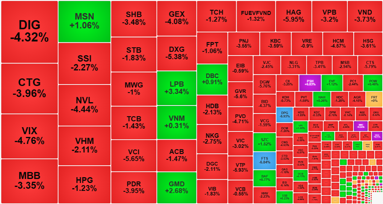 Chỉ số đóng cửa ở mức điểm số thấp nhất ngày và hàng trăm cổ phiếu cũng tương tự. Đó là biểu hiện rõ nhất của áp lực bán tháo. Độ rộng của VN-Index chốt phiên sáng còn khá tốt với 191 mã tăng/227 mã giảm nhưng kết phiên chỉ còn 137 mã tăng/348 mã giảm. Phiên sáng mới có 84 mã giảm hơn 1%, cuối ngày là 162 mã.
