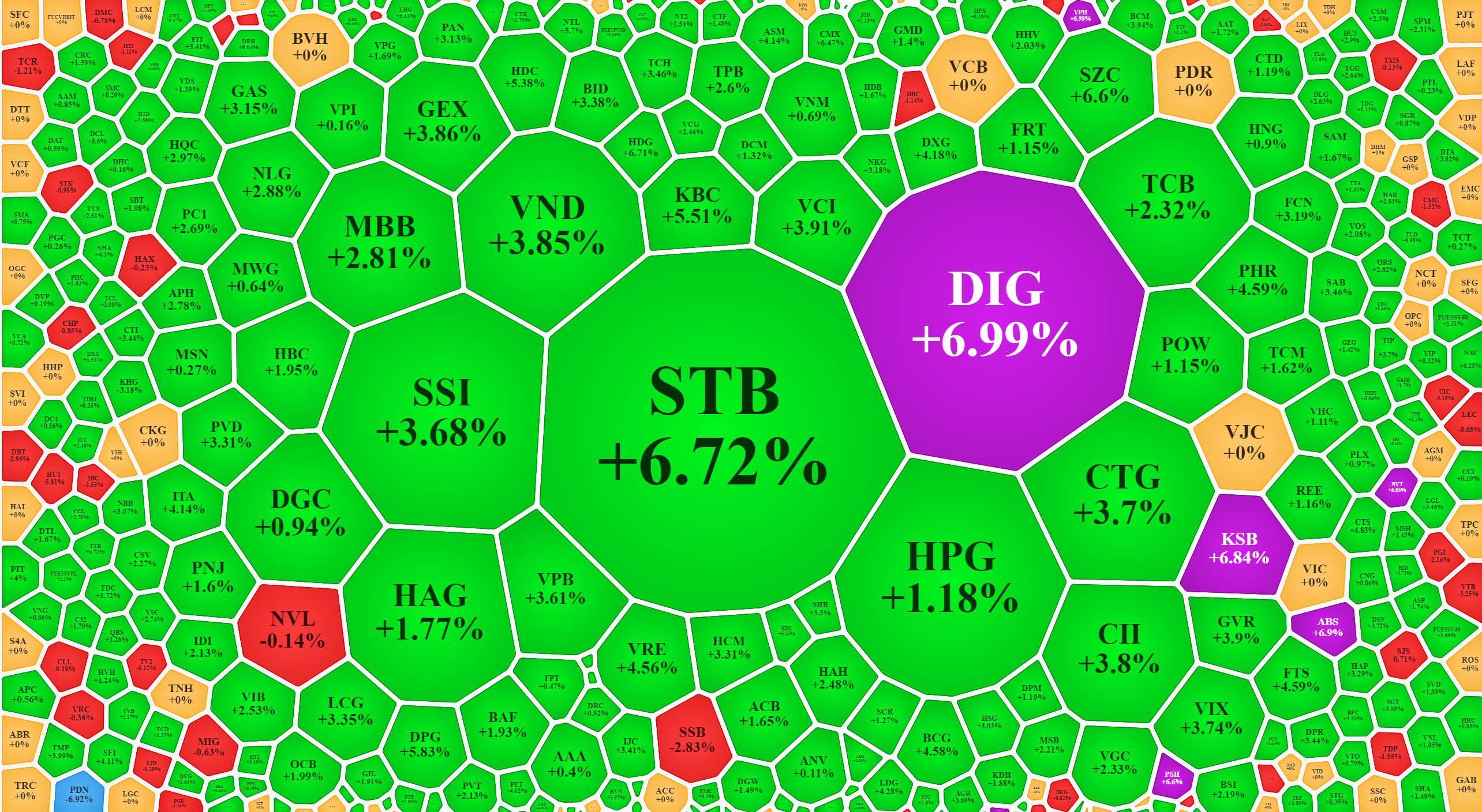 Top 10 giao dịch lớn nhất toàn thị trường thì 9 mã tăng trên 3% giá trị. HPG tăng yếu nhất cũng là 1,18%. STB dẫn đầu cả về giá lẫn thanh khoản, với mức tăng 6,72%, giao dịch 601 tỷ đồng. Nhìn theo nhóm ngành thì nhóm năng lượng đang tăng 2,05%, nhóm tài chính tăng 2,27% là mạnh nhất sàn HoSE. Nhóm tăng kịch trần xuất hiện DIG giao dịch rất mạnh với 390,2 tỷ đồng. Cổ phiếu này đã tăng tới 51,2% chỉ trong 28 phiên gần nhất.