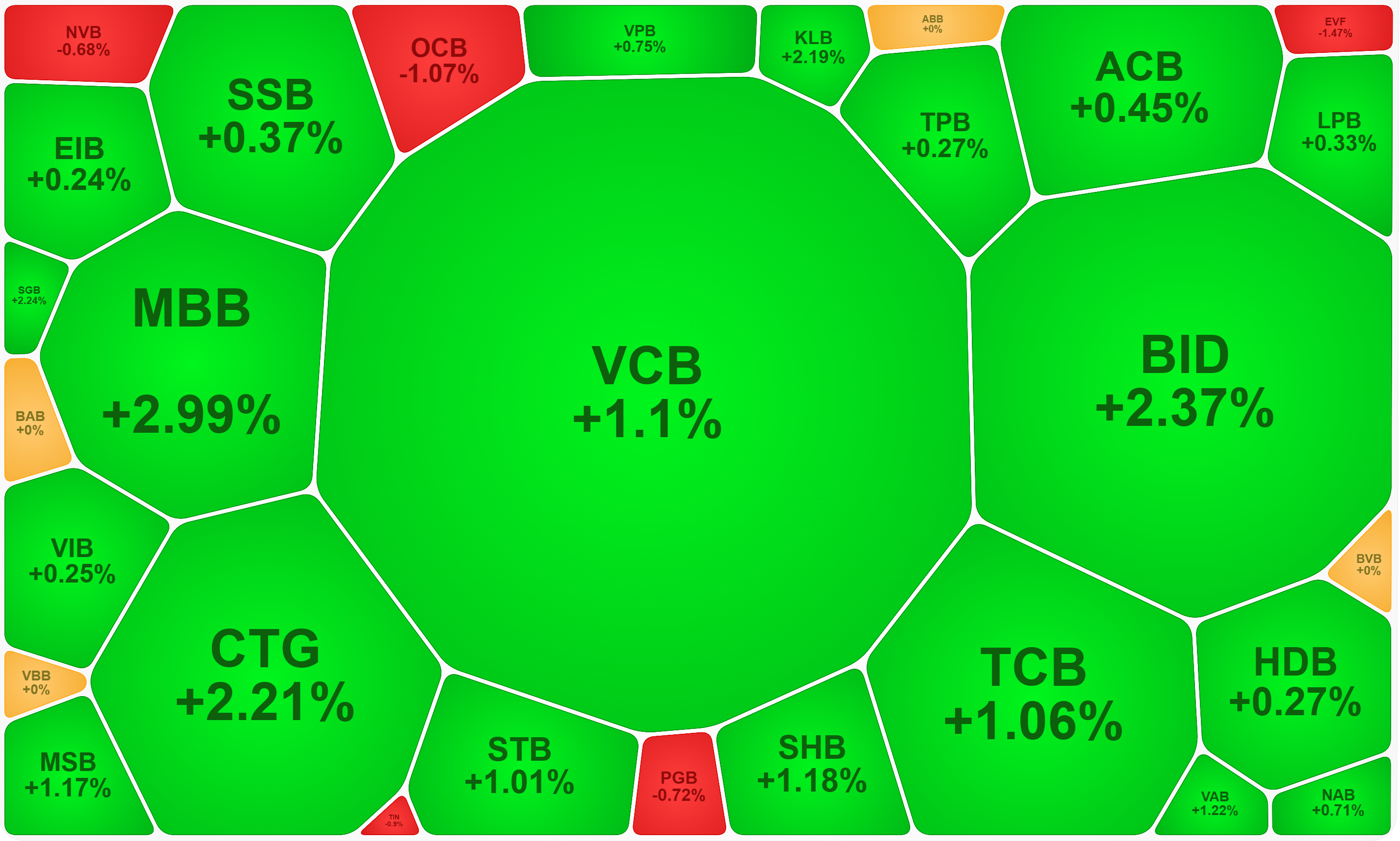 Các cổ phiếu ngân hàng blue-chips khác cũng phục hồi rất tốt phiên chiều: MBB tăng thêm 1,97%, chốt ngày tăng 2,99%; ACB tăng thêm 0,68%, chốt tăng 0,45%, đổi màu giá thành công; CTG tăng thêm 1,52%, chốt tăng 2,21%; HDB tăng thêm 0,54%, cũng đổi màu giá thành công nhờ mức tăng nhẹ 0,27% so với tham chiếu; STB tăng thêm 1,18%, TCB tăng thêm 1,37%, TPB tăng thêm 0,27%, VIB tăng thêm 0,25%, VPB tăng thêm 0,75%...
