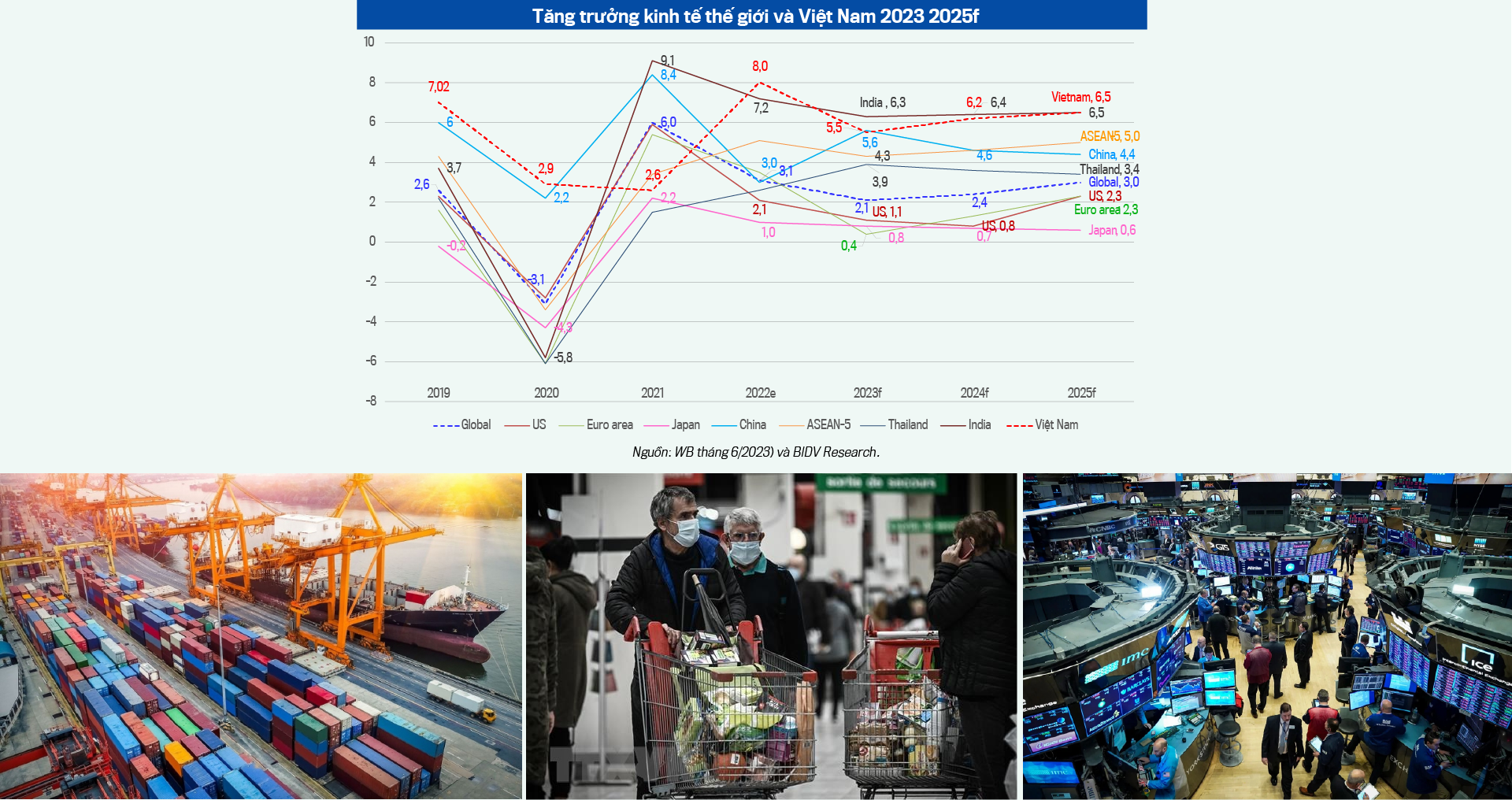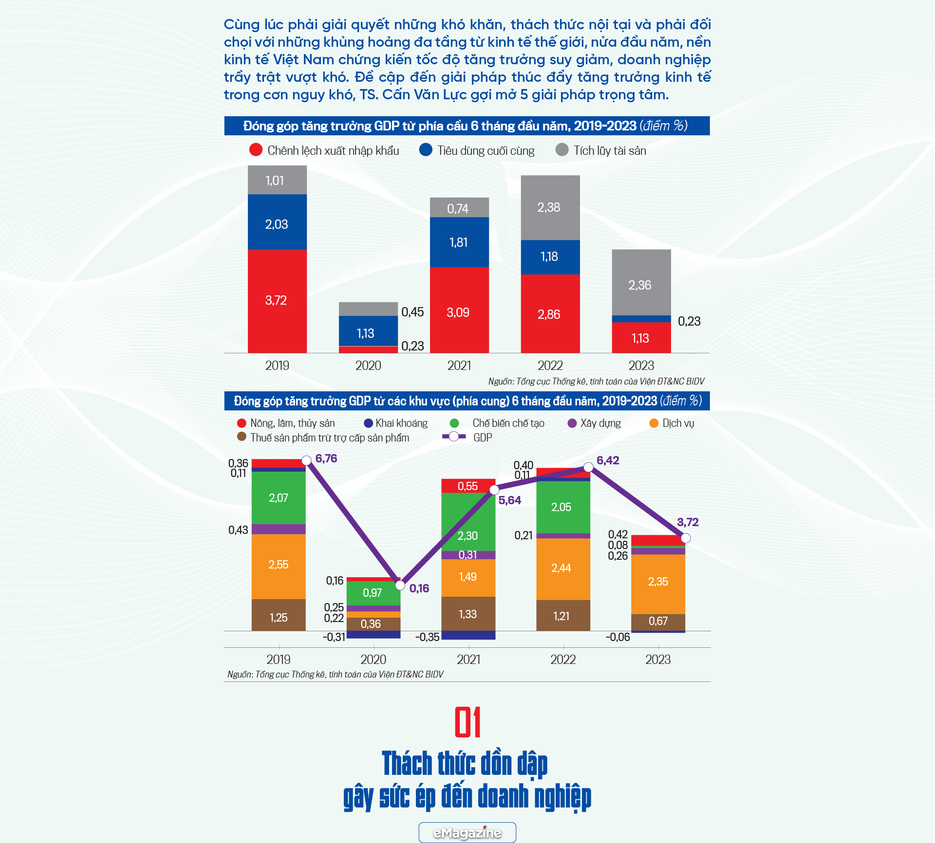 Theo phân tích của TS. Cấn Văn Lực, rủi ro bên ngoài khi kinh tế thế giới suy thoái nhẹ, cục bộ khiến thị trường xuất khẩu tiếp tục đà suy giảm dù có phần chậm lại (giảm 15,2%). Sản xuất công nghiệp bị thu hẹp, giảm 1,2% so cùng kỳ và Chỉ số nhà quản trị mua hàng (PMI) ngành sản xuất ở mức thu hẹp, duy trì dưới 50 điểm nhiều tháng liên tiếp, ngoại trừ tháng 2/2023 ở mức 51,2 điểm, trong tháng 6/2023 đạt 46,2 điểm. Cùng với đó, thu hút vốn FDI kém khả quan khi vốn đăng ký giảm 4,3%, giải ngân FDI tăng nhẹ 0,5%. Những khó khăn dồn dập khiến thu ngân sách nhà nước giảm 7,8% vì kinh tế tăng trưởng thấp, hoạt động của doanh nghiệp gặp nhiều khó khăn.