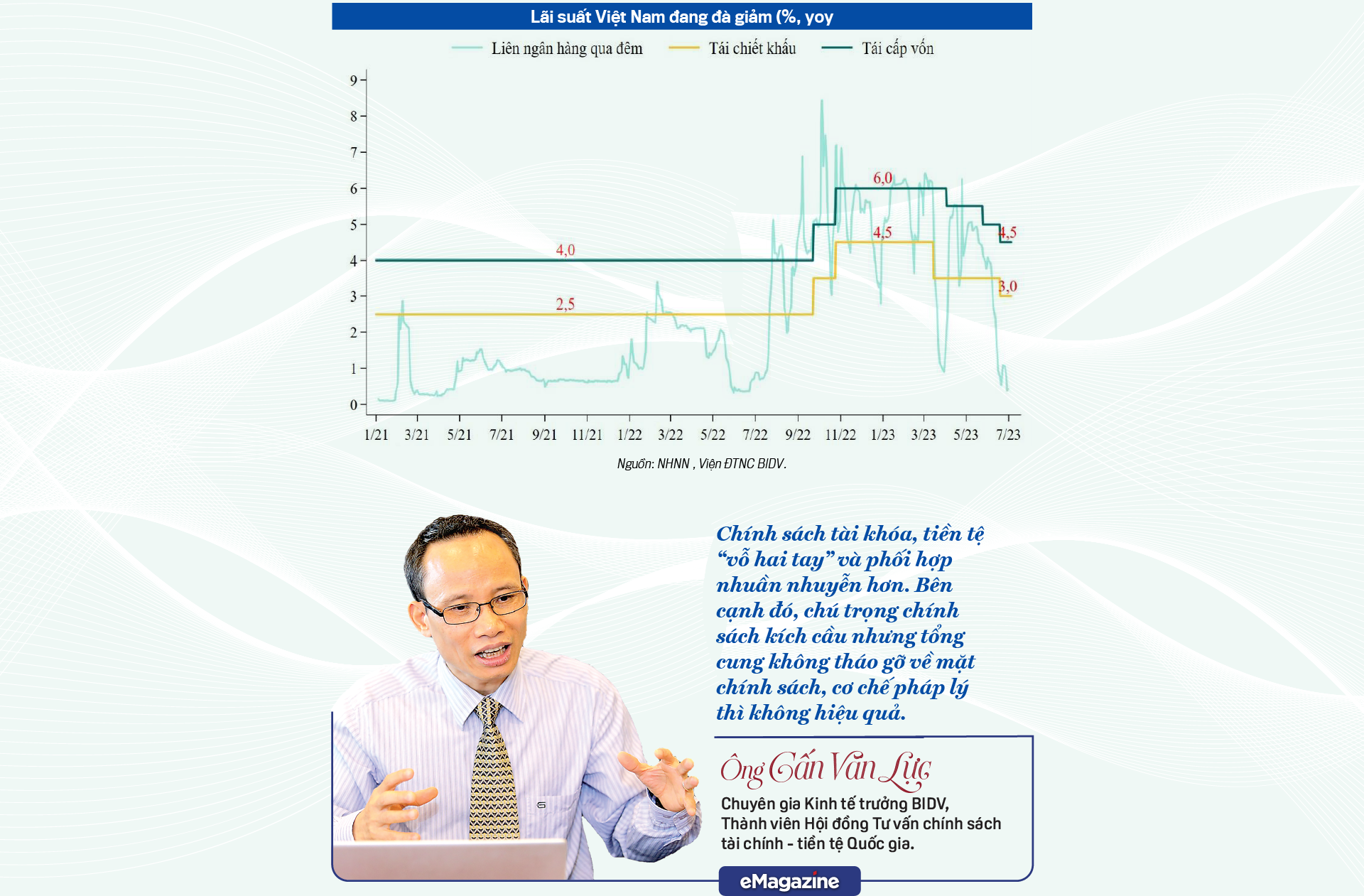 Ba, tiếp tục phối hợp chính sách hiệu quả, đặc biệt giữa chính sách tiền tệ, chính sách tài khóa và các chính sách vĩ mô khác, nhằm tiếp tục giảm lãi suất, bình ổn tỷ giá, giá hàng hóa thiết yếu và các thị trường tài chính, xây dựng, bất động sản, lao động… góp phần kiểm soát lạm phát, đảm bảo ổn định vĩ mô, hỗ trợ phục hồi tăng trưởng. “Chính sách tài khóa, tiền tệ “vỗ hai tay” và phối hợp nhuần nhuyễn hơn. Bên cạnh đó, chú trọng chính sách kích cầu nhưng tổng cung không tháo gỡ về mặt chính sách, cơ chế pháp lý thì không hiệu quả”, ông Lực lưu ý.
