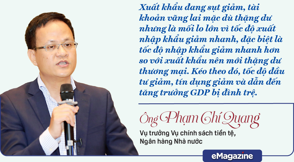Hai, “xuất khẩu đang sụt giảm, tài khoản vãng lai mặc dù thặng dư nhưng là mối lo lớn vì tốc độ xuất nhập khẩu giảm nhanh, đặc biệt là tốc độ nhập khẩu giảm nhanh hơn so với xuất khẩu nên mới thặng dư thương mại. Kéo theo đó, tốc độ đầu tư giảm, tín dụng giảm và dẫn đến tăng trưởng GDP bị đình trệ”, đại diện Ngân hàng Nhà nước phân tích.