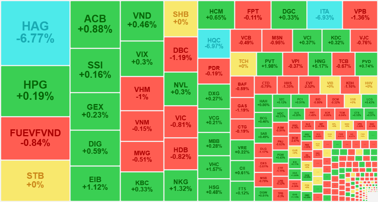 Phía tăng đang có 131 cổ phiếu nhưng chỉ 36 mã tăng trên 1% và chủ yếu là thanh khoản nhỏ. Đáng kể có HNG tăng 5,17% với 33,5 tỷ; PVT tăng 1,98% với 37 tỷ; VHC tăng 1,57% với 44,9 tỷ; NKG tăng 1,32% với 63,8 tỷ; EIB tăng 1,12% với 106,3 tỷ…