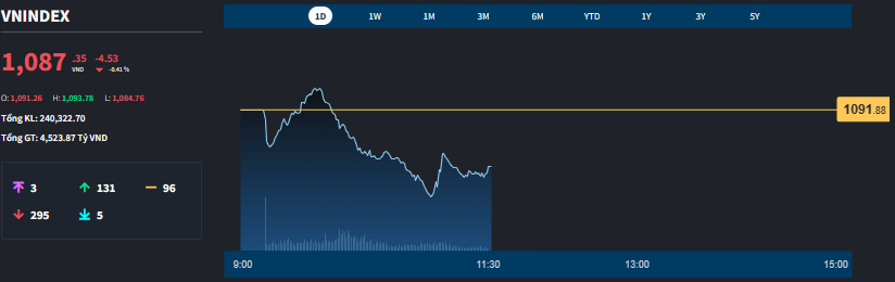 Tính theo mức đóng cửa, VN-Index kết thúc phiên sáng ở mức 1.087,35 điểm tương đương với mức chốt thấp nhất ngày 27/11 (1.088,06 điểm). Điểm thấp nhất chỉ số chạm tới phiên này là 1.084,76, cũng gần sát mốc 1080 điểm, ngưỡng hỗ trợ vốn được kiểm định hai lần trong tháng 11.