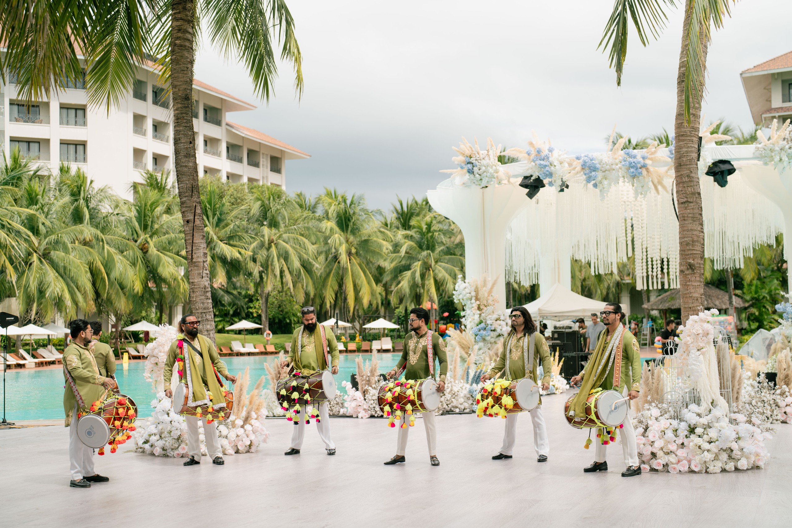 Tương tự, trong hai ngày 02–03/02/2026 vừa qua, đám cưới của cô dâu Shreya và chú rể Ayush (Ấn Độ) đã được tổ chức tại Đà Nẵng với sự tham dự của hơn 250 khách mời. Sự kiện diễn ra trang trọng, kết hợp các nghi lễ truyền thống đặc trưng của Ấn Độ như Gauri Pooja, Sehrabandi và Baraat, tạo nên không gian lễ cưới giàu cảm xúc và đậm dấu ấn văn hóa.