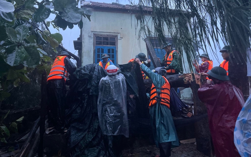 Cán bộ, chiến sĩ Đồn Biên phòng Lăng Cô, huyện Phú Lộc (Thừa Thiên Huế) giúp dân khắc phục hậu quả do gió lốc.