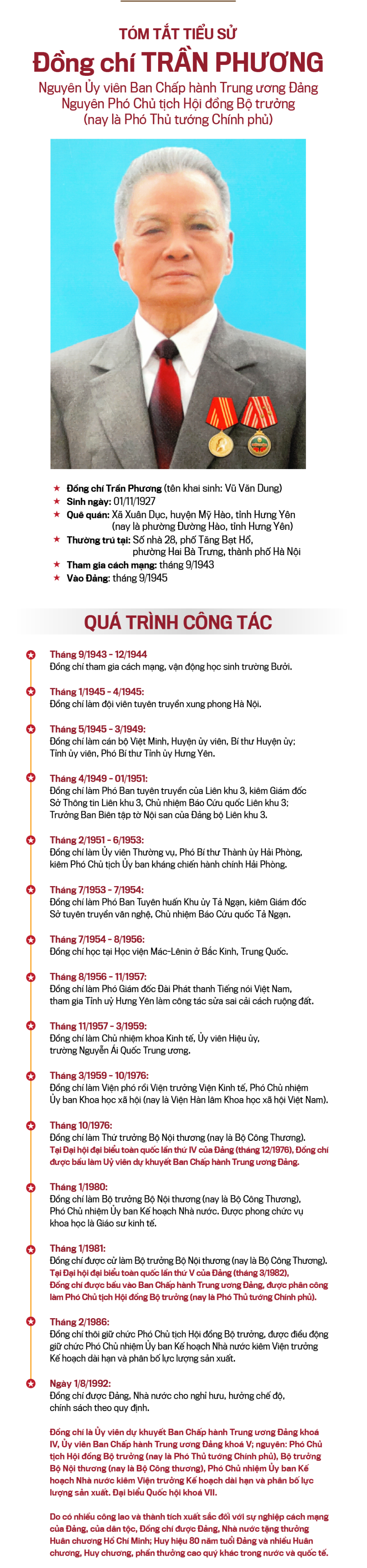 Đồng chí Trần Phương (tên khai sinh: Vũ Văn Dung), sinh ngày 01 tháng 11 năm 1927; quê quán: Xã Xuân Dục, huyện Mỹ Hào, tỉnh Hưng Yên (nay là phường Đường Hào, tỉnh Hưng Yên); thường trú tại số nhà 28, phố Tăng Bạt Hổ, phường Hai Bà Trưng, thành phố Hà Nội; tham gia hoạt động cách mạng tháng 9 năm 1943; vào Đảng tháng 9 năm 1945. Đồng chí nguyên là Uỷ viên dự khuyết Ban Chấp hành Trung ương Đảng khoá IV; Uỷ viên Ban Chấp hành Trung ương Đảng khoá V; Phó Chủ tịch Hội đồng Bộ trưởng (nay là Phó Thủ tướng Chính phủ); Bộ trưởng Bộ Nội thương (nay là Bộ Công Thương); Phó Chủ nhiệm Uỷ ban Kế hoạch Nhà nước; đại biểu Quốc hội khoá VII.