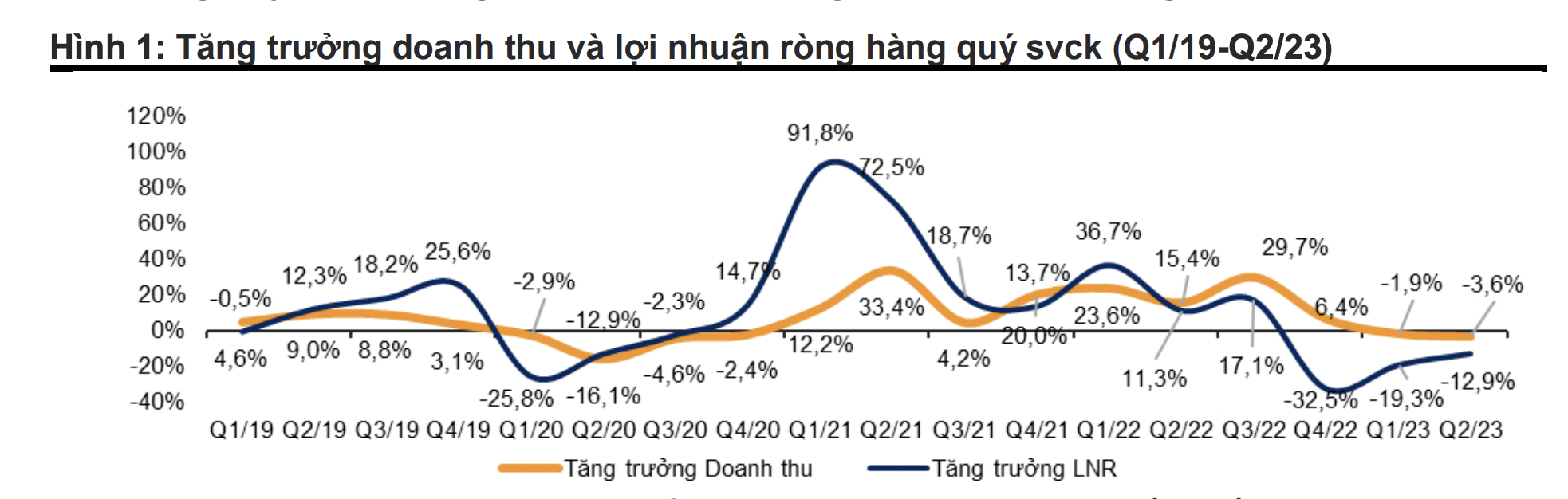 Bất động sản và Dịch vụ Tài chính dẫn dắt đà tăng trưởng lợi nhuận của thị trường. Sau khi lợi nhuận sụt giảm so với cùng kỳ trong Q1/23, Dịch vụ Tài chính đã quay trở lại tăng trưởng mạnh mẽ trong Q2/23 với mức tăng 943% so với cùng kỳ, nhờ vào hiệu suất tích cực của Vn-Index ( 5,2% so với quý trước) trong Q2/23; hoạt động giao dịch cải thiện đáng kể (giá trị giao dịch bình quân phiên tăng 27% sv quý trước) sau khi Ngân hàng Nhà nước cắt giảm lãi suất.