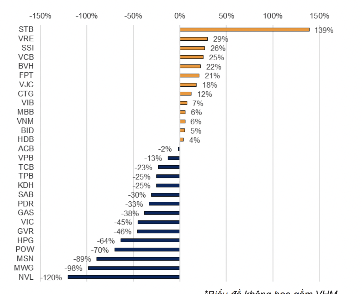 Xét theo nhóm vốn hóa, lợi nhuận của VN30 tăng 2,3% so với cùng kỳ năm Q2/23 trong khi các nhóm khác ghi nhận tăng trưởng âm. 13 doanh nghiệp trong VN30 ghi nhận tăng trưởng lợi nhuận ròng trong Q2/23, dẫn đầu là VHM ( 1.348%), STB ( 139%) và SSI ( 64%). Dù không không ghi nhận doanh thu bán buôn, VHM vẫn tăng trưởng lợi nhuận ròng ấn tượng nhờ bàn giao căn hộ tại Vinhomes Ocean Park 2 – The Empire.