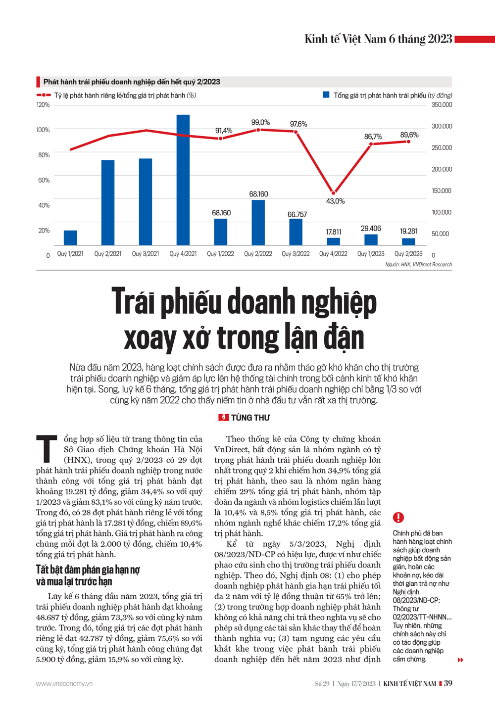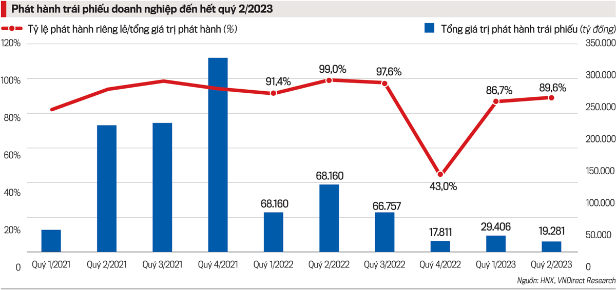 Tổng hợp số liệu từ trang thông tin của Sở Giao dịch Chứng khoán Hà Nội (HNX), trong quý 2/2023 có 29 đợt phát hành trái phiếu doanh nghiệp trong nước thành công với tổng giá trị phát hành đạt khoảng 19.281 tỷ đồng, giảm 34,4% so với quý 1/2023 và giảm 83,1% so với cùng kỳ năm trước. Trong đó, có 28 đợt phát hành riêng lẻ với tổng giá trị phát hành là 17.281 tỷ đồng, chiếm 89,6% tổng giá trị phát hành. Giá trị phát hành ra công chúng mỗi đợt là 2.000 tỷ đồng, chiếm 10,4% tổng giá trị phát hành.