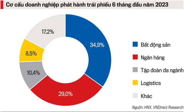 Theo thống kê của Công ty chứng khoán VnDirect, bất động sản là nhóm ngành có tỷ trọng phát hành trái phiếu doanh nghiệp lớn nhất trong quý 2 khi chiếm hơn 34,9% tổng giá trị phát hành, theo sau là nhóm ngân hàng chiếm 29% tổng giá trị phát hành, nhóm tập đoàn đa ngành và nhóm logistics chiếm lần lượt là 10,4% và 8,5% tổng giá trị phát hành, các nhóm ngành nghề khác chiếm 17,2% tổng giá trị phát hành.