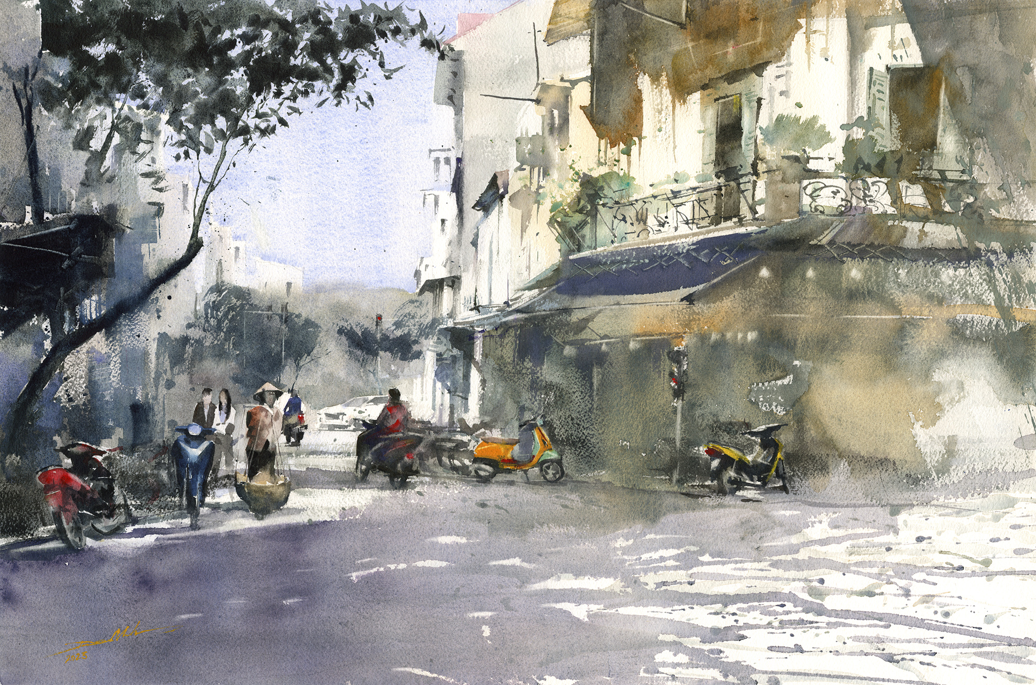 Màu nước, vốn được xem là chất liệu mong manh, nhẹ và khó kiểm soát, trở thành thế mạnh lớn nhất của Đàm Minh. Anh được đánh giá là một trong những họa sĩ hiếm hoi làm chủ hoàn toàn kỹ thuật màu nước, từ độ loang, sắc độ, hạt màu đến không gian thị giác.