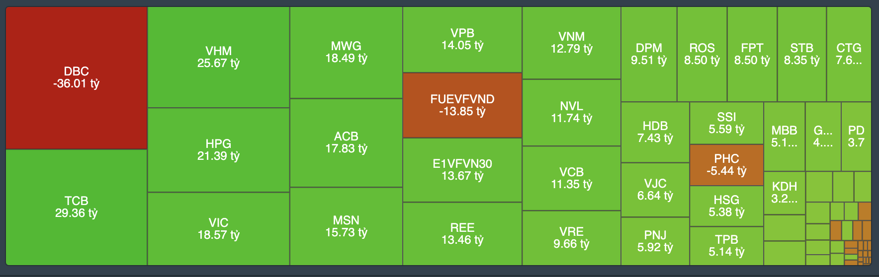 Ở chiều ngược lại, tự doanh tập trung xả chủ yếu ở DBC với 36,1 tỷ; FUEVFVND; PHC, nhìn chung giá trị xả ròng cũng không đáng kể lắm.