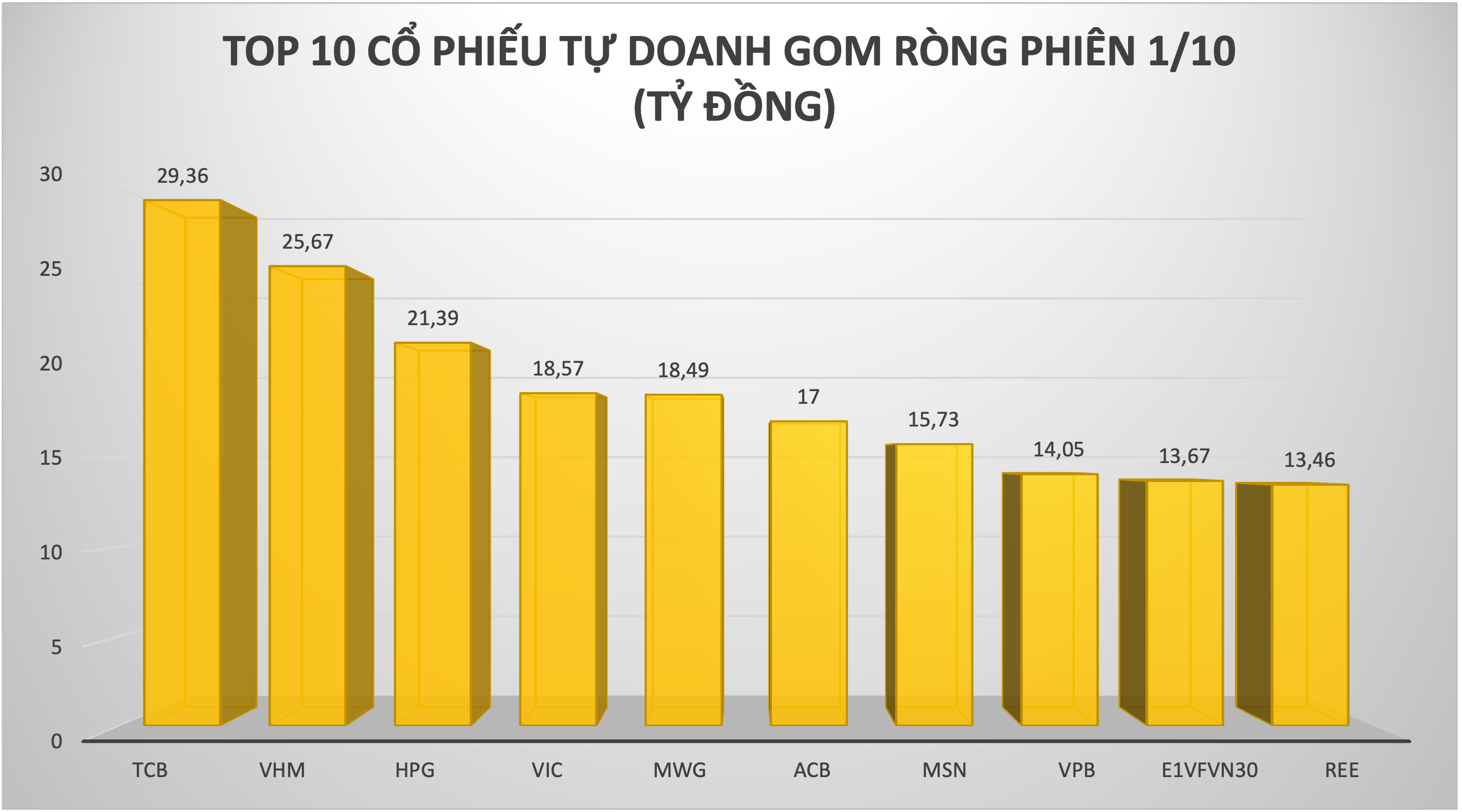 TCB được khối tự doanh mua ròng mạnh nhất với giá trị 154 tỷ đồng. Đứng thứ 2 trong danh sách mua ròng của khối tự doanh vẫn thuộc về một mã ngân hàng là VPB với giá trị 113 tỷ đồng. Tiếp sau đó, HPG và DXG được mua ròng lần lượt 98 tỷ đồng và 74 tỷ đồng. Ở chiều ngược lại, FPT bị bán ròng mạnh nhất với giá trị 52 tỷ đồng. PHC và KDH bị bán ròng lần lượt 30 tỷ đồng và 25 tỷ đồng.