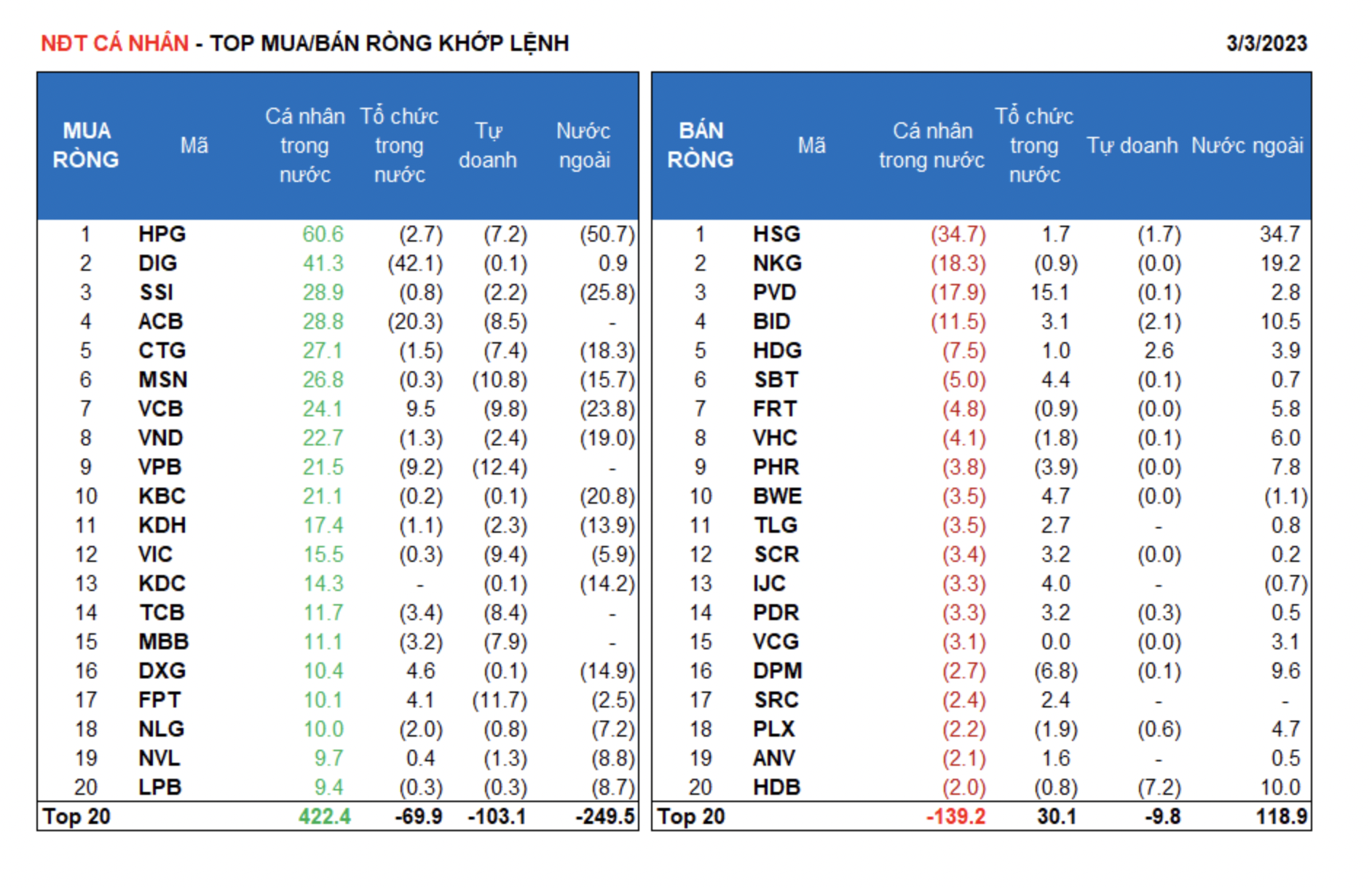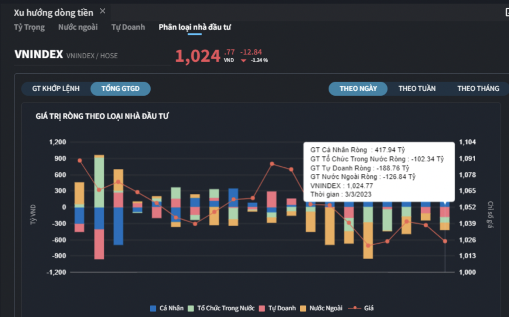 Nhà đầu tư cá nhân là bên duy nhất mua ròng trong phiên hôm nay với giá trị gom ròng 417.9 tỷ đồng, trong đó nhóm này mua ròng khớp lệnh là 389.4 tỷ đồng...