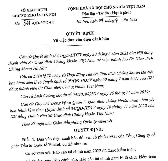 Tổng Công ty Cổ phần Đầu tư Quốc tế Viettel (mã chứng khoán VGI) vừa có công văn phản hồi về việc Sở Giao dịch Chứng khoán Hà Nội trước đó quyết định đưa cổ phiếu VGI vào diện cảnh báo…