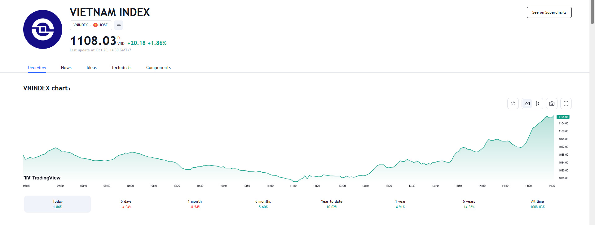 Kết thúc phiên giao dịch ngày 20/10, VN-Index đi xuống 4 phiên trong tuần, mất 46,7 điểm, tương đương 4,04% xuống 1.108,03 điểm.