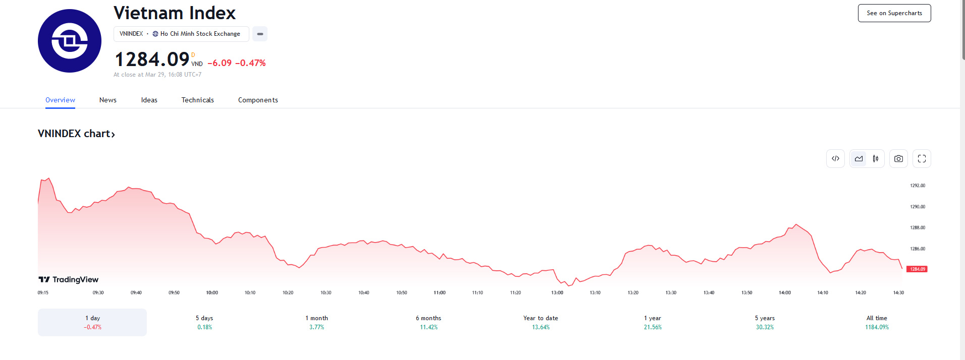 “Chỉ số có phiên thứ 2 liên tiếp điều chỉnh giảm sau khi tiến sát tới vùng kháng cự tâm lý mạnh 1.292-1.300 điểm. Chỉ số có thể sẽ cần thời gian di chuyển giằng co tích lũy quanh vùng giá hiện tại (1.265-1.285 điểm), trước khi có thể bứt phá khỏi vùng giá trên.