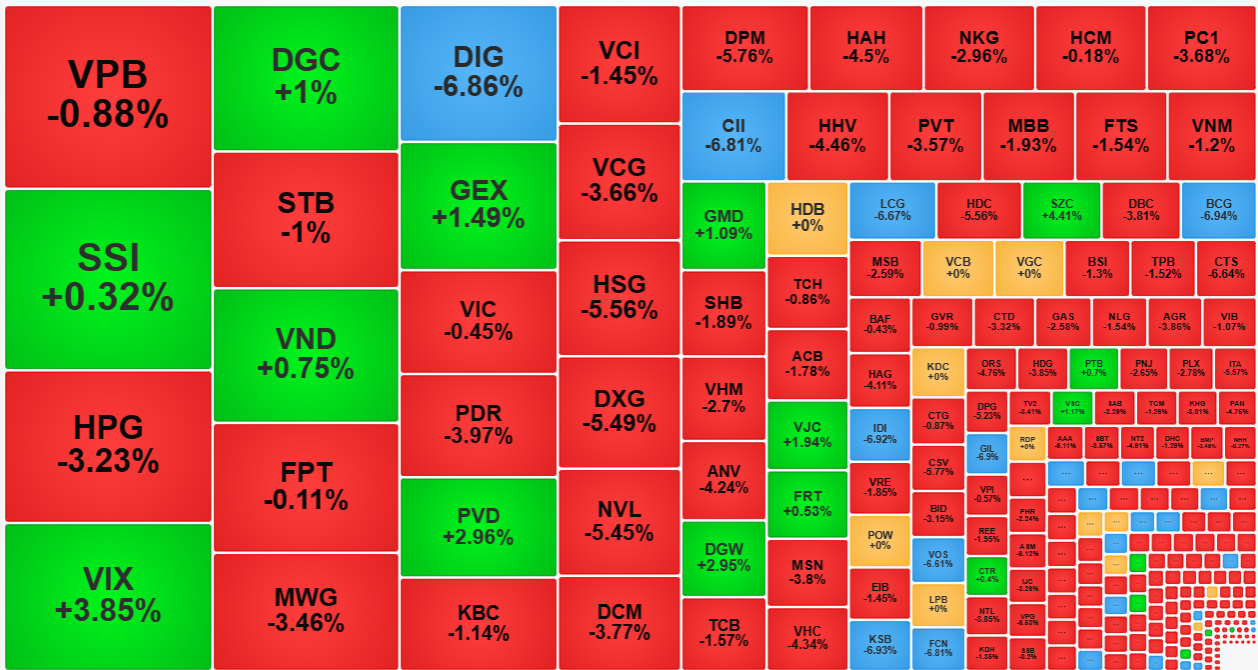 HoSE đóng cửa vẫn có 27 mã giảm hết biên độ, trong đó nhiều mã thanh khoản rất lớn như BCG khớp 104,4 tỷ đồng, DIG khớp 509,5 tỷ, CII khớp 222,7 tỷ, LCG khớp 120,2 tỷ. Tính chung nhóm giảm trên 3% hôm nay có tới 22 mã thanh khoản trên 100 tỷ đồng.
