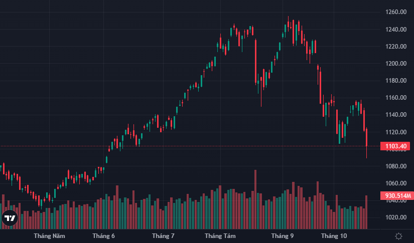 VN-Index đóng cửa hôm nay đã rơi xuống 1.103,4 tỷ đồng, thấp hơn mức đáy hồi đầu tháng 10. Về mặt kỹ thuật thị trường đã thủng đáy, tuy nhiên vẫn có cơ hội phục hồi lên trên mức đáy nay nếu như phiên tới vẫn có cầu đẩy lên mạnh. Thanh khoản tăng vọt lên trên 22 ngàn tỷ đồng là tín hiệu tốt khi thể hiện dòng tiền bắt đáy hoạt động trở lại sau nhiều ngày thờ ơ khiến thanh khoản chỉ loanh quanh 13-15 ngàn tỷ đồng.