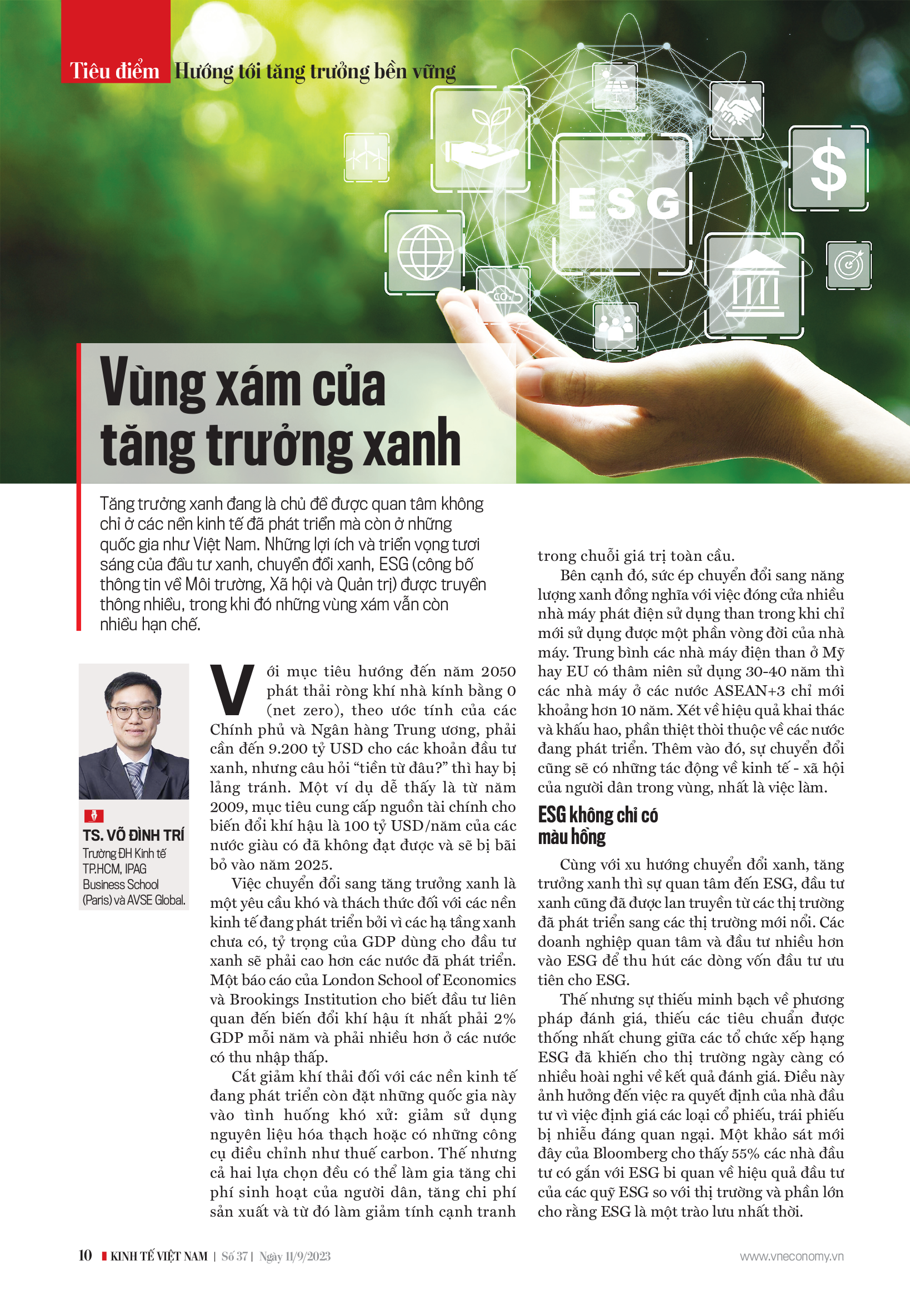 "Tăng trưởng xanh, đầu tư xanh đang là xu hướng ở các nền kinh tế mới nổi như Việt Nam với nhiều hứa hẹn. Một ước tính cho thấy đóng góp của kinh tế xanh vào GDP của Việt Nam đến năm 2050 là 300 tỷ USD. Tuy vậy, chính phủ, doanh nghiệp, và nhà đầu tư cần có thêm góc nhìn và tỉnh táo trước sự lung linh của xu hướng này.
