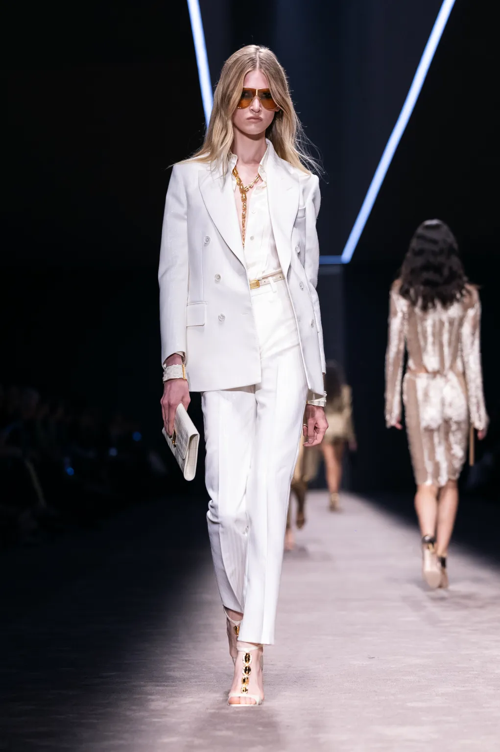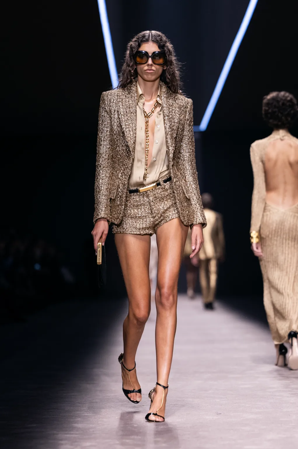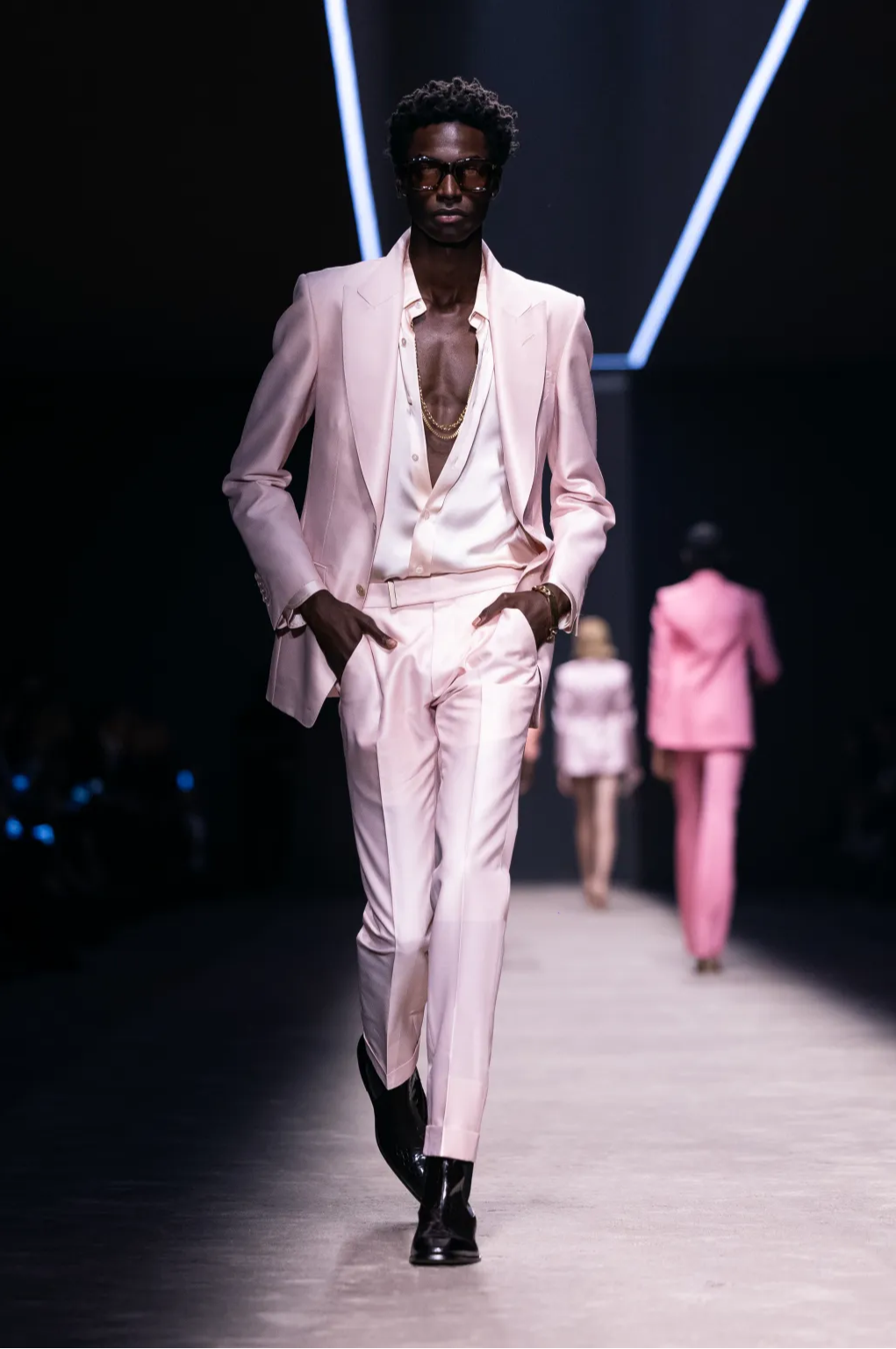Trên sàn diễn Xuân - Hè 2024, những thiết kế đã làm nên tên tuổi Tom Ford như bộ suit với quần ống skinny, những chiếc váy hở lưng ôm sát, những chiếc quần short siêu ngắn và lối phối đồ bỏ qua áo lót liên tiếp xuất hiện trở lại. Rất nhiều bộ suit trên sàn diễn được làm từ chất liệu nhung, một chất liệu đã gắn liền với Tom Ford kể từ những ngày tháng tại Gucci. Hình ảnh Gwyneth Paltrow trong bộ suit đỏ đã đi vào lịch sử thời trang như một trong những khoảnh khắc đáng nhớ nhất trên thảm đỏ trong thập niên 1990. “Không ai qua mặt được chúng tôi về khoản vest nhung”, Peter Hawkings nói.
