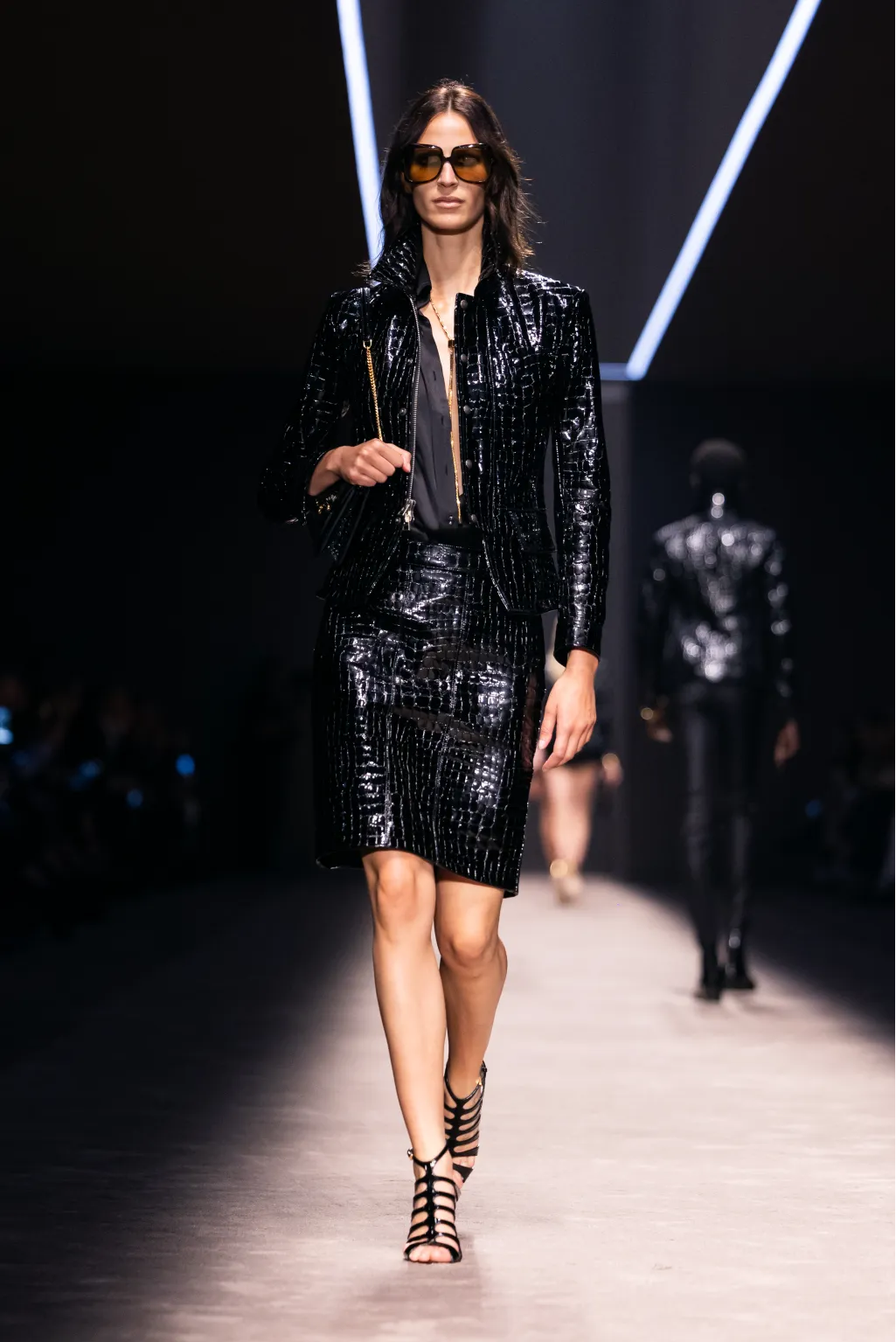 Ngoài ra có nhiều bộ cánh làm từ da thuộc với phụ tùng bóng loáng, và những set đen từ đầu đến chân gợi nhắc đến phong cách rocker chic của nhà Saint Laurent mà Tom Ford cũng từng chịu trách nhiệm làm mới Yves Saint Laurent sau khi thương hiệu được mua lại bởi tập đoàn Gucci tạo nên tập đoàn PPR (Kering ngày nay).