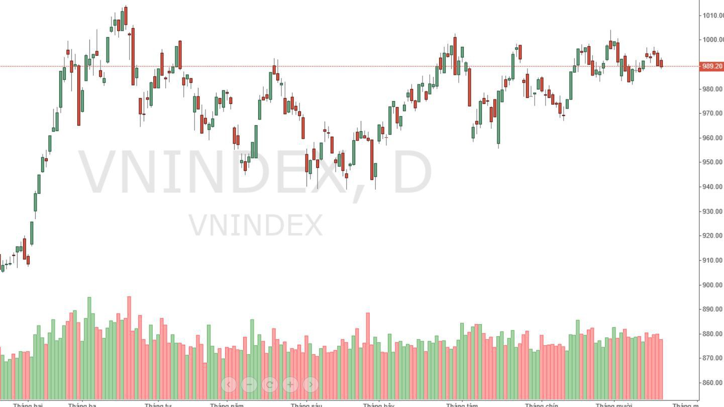 Về góc độ phân tích kỹ thuật, xu hướng hiện nay vẫn là giằng co và tích lũy trong biên độ hẹp từ 980 – 1.000 điểm. Khi nào thị trường vẫn nằm trong kênh biến động này thì các rủi ro là không đáng kể.